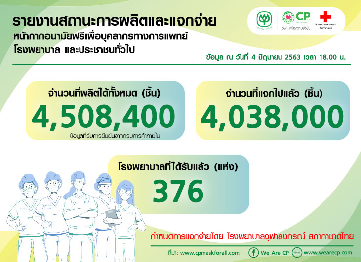 รายงานสถานะการผลิตและแจกจ่ายหน้ากากอนามัยฟรีเพื่อบุคลากรทางการแพทย์ รพ.และประชาชนทั่วไป / 4 มิ.ย. 63 : 18.00 น. 5 มิถุนายน 2563SystemCP Mask ภารกิจนี้เพื่อชาติ, News สามารถอัพเดทความเคลื่อนไหวได้ที่ > www.cpmaskforall.com Post Views: 1,243