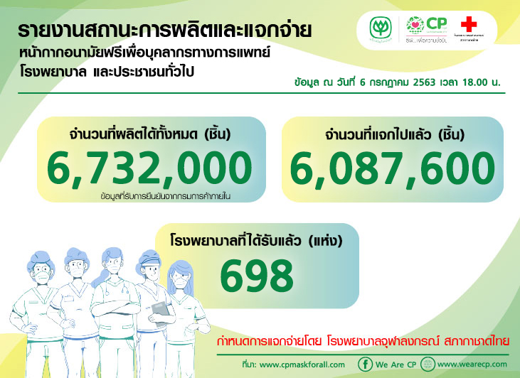 รายงานสถานะการผลิตและแจกจ่ายหน้ากากอนามัยฟรีเพื่อบุคลากรทางการแพทย์ รพ.และประชาชนทั่วไป / 6 ก.ค. 63 : 18.00 น. 7 กรกฎาคม 2563SystemCP Mask ภารกิจนี้เพื่อชาติ, News สามารถอัพเดทความเคลื่อนไหวได้ที่ > www.cpmaskforall.com Post Views: 1,195