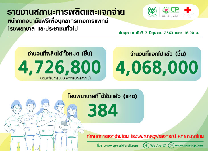 รายงานสถานะการผลิตและแจกจ่ายหน้ากากอนามัยฟรีเพื่อบุคลากรทางการแพทย์ รพ.และประชาชนทั่วไป / 7 มิ.ย. 63 : 18.00 น. 8 มิถุนายน 2563SystemCP Mask ภารกิจนี้เพื่อชาติ, News สามารถอัพเดทความเคลื่อนไหวได้ที่ > www.cpmaskforall.com Post Views: 1,216
