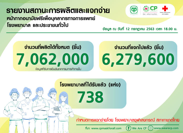 รายงานสถานะการผลิตและแจกจ่ายหน้ากากอนามัยฟรีเพื่อบุคลากรทางการแพทย์ รพ.และประชาชนทั่วไป / 12 ก.ค. 63 : 18.00 น. 13 กรกฎาคม 2563SystemCP Mask ภารกิจนี้เพื่อชาติ, News สามารถอัพเดทความเคลื่อนไหวได้ที่ > www.cpmaskforall.com Post Views: 1,172