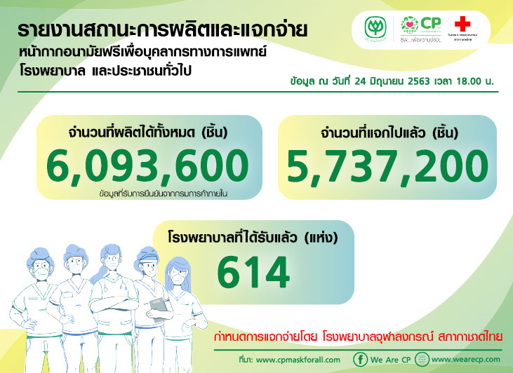 รายงานสถานะการผลิตและแจกจ่ายหน้ากากอนามัยฟรีเพื่อบุคลากรทางการแพทย์ รพ.และประชาชนทั่วไป / 24 มิ.ย. 63 : 18.00 น. 25 มิถุนายน 2563SystemCP Mask ภารกิจนี้เพื่อชาติ, News สามารถอัพเดทความเคลื่อนไหวได้ที่ > www.cpmaskforall.com Post Views: 1,183