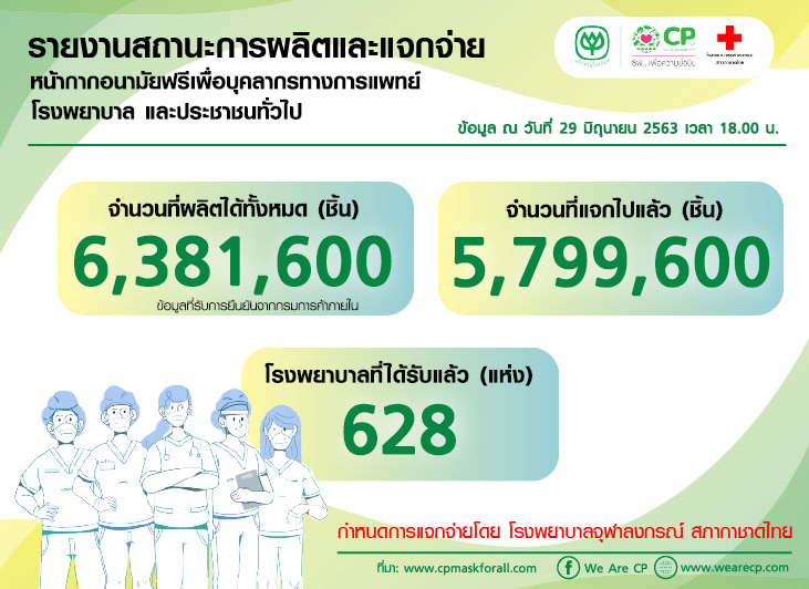 รายงานสถานะการผลิตและแจกจ่ายหน้ากากอนามัยฟรีเพื่อบุคลากรทางการแพทย์ รพ.และประชาชนทั่วไป / 29 มิ.ย. 63 : 18.00 น. 30 มิถุนายน 2563SystemCP Mask ภารกิจนี้เพื่อชาติ, News สามารถอัพเดทความเคลื่อนไหวได้ที่ > www.cpmaskforall.com Post Views: 1,130