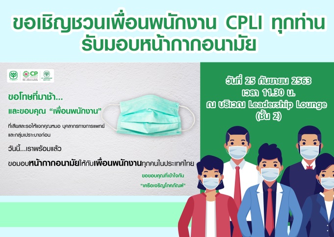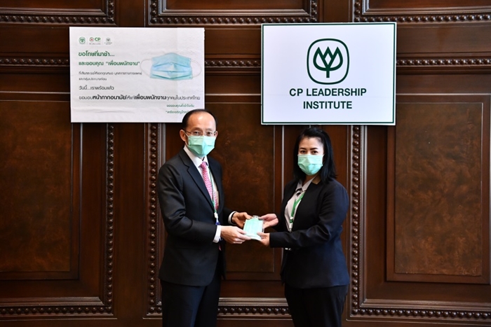 เมื่อวันศุกร์ที่ 25 กันยายน 2563 ที่ผ่านมา คุณสมชาย ศรีภูสิตโต ผู้ช่วยบริหารของประธาน สถาบันผู้นำเครือเจริญโภคภัณฑ์ ให้เกียรติเป็นประธานในการส่งมอบหน้ากากอนามัยซีพี จำนวน 2,000 ชิ้น ให้แก่เพื่อนพนักงานสังกัด บริษัท พัฒนาผู้นำเครือเจริญโภคภัณฑ์ จำกัด เป็นที่เรียบร้อย