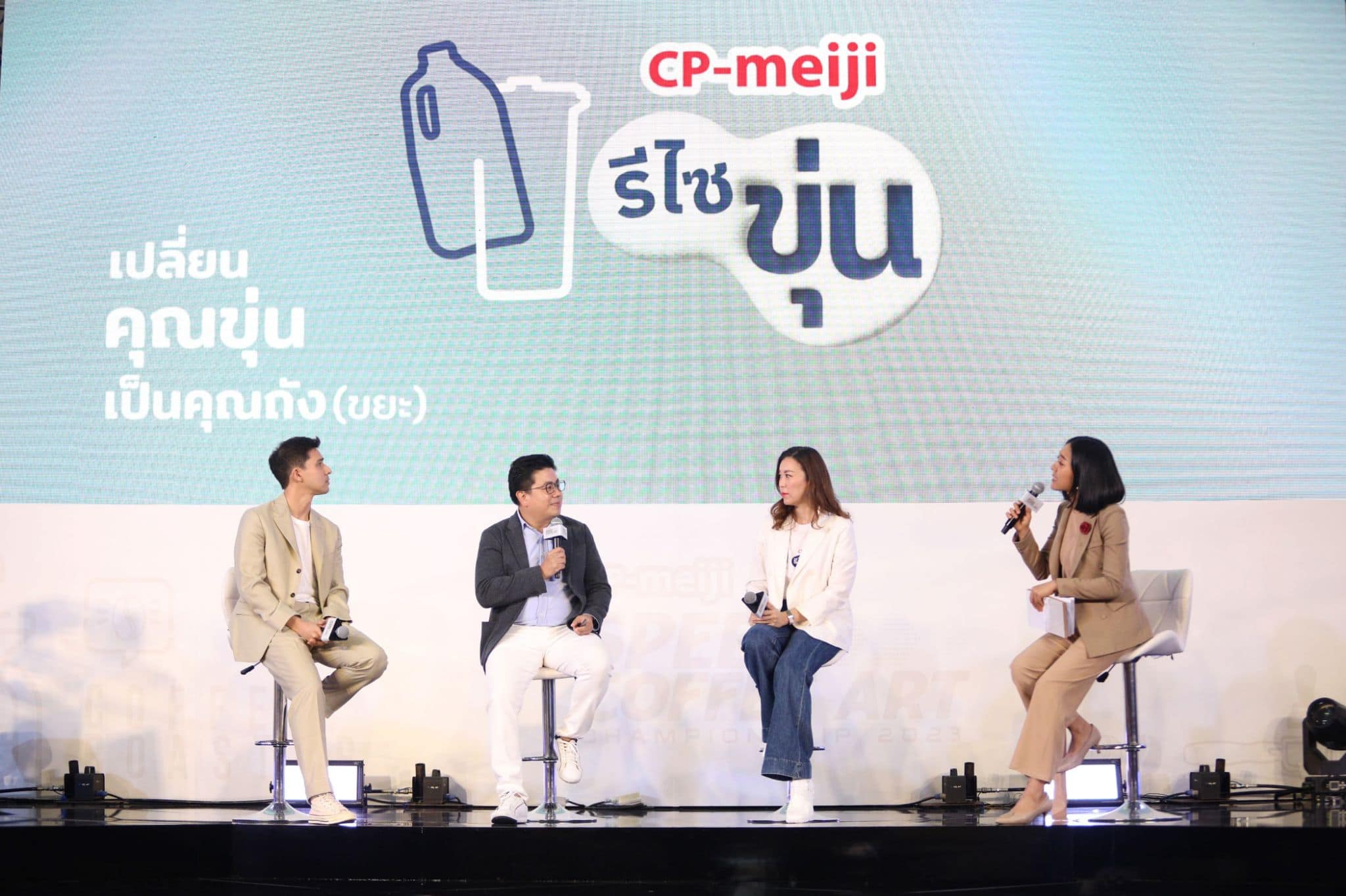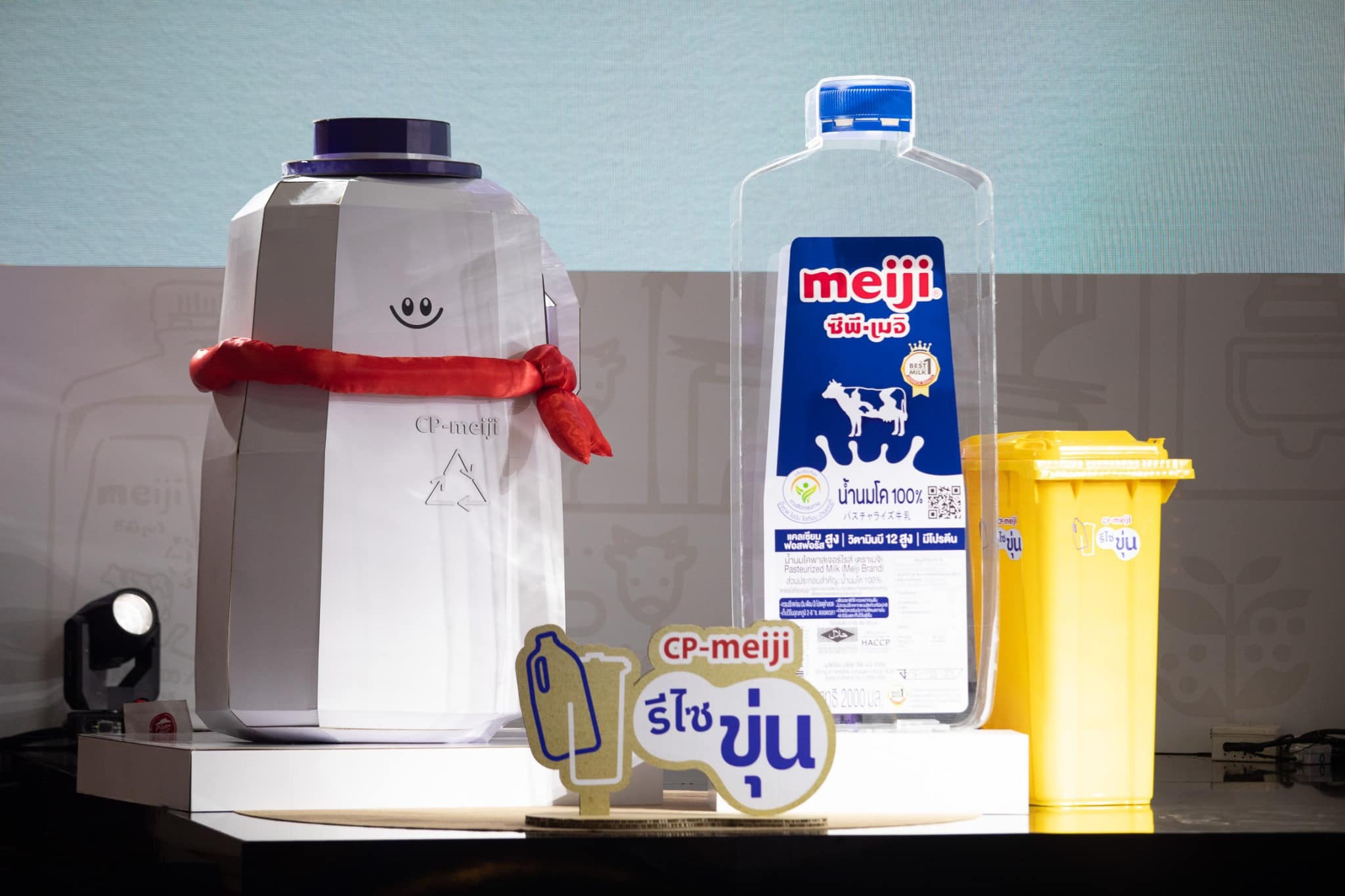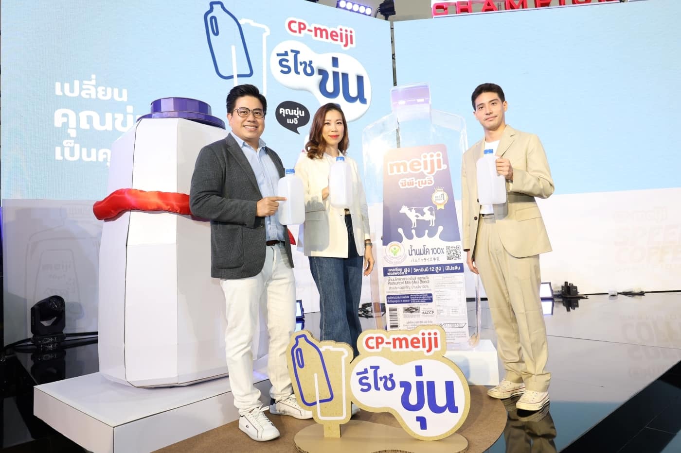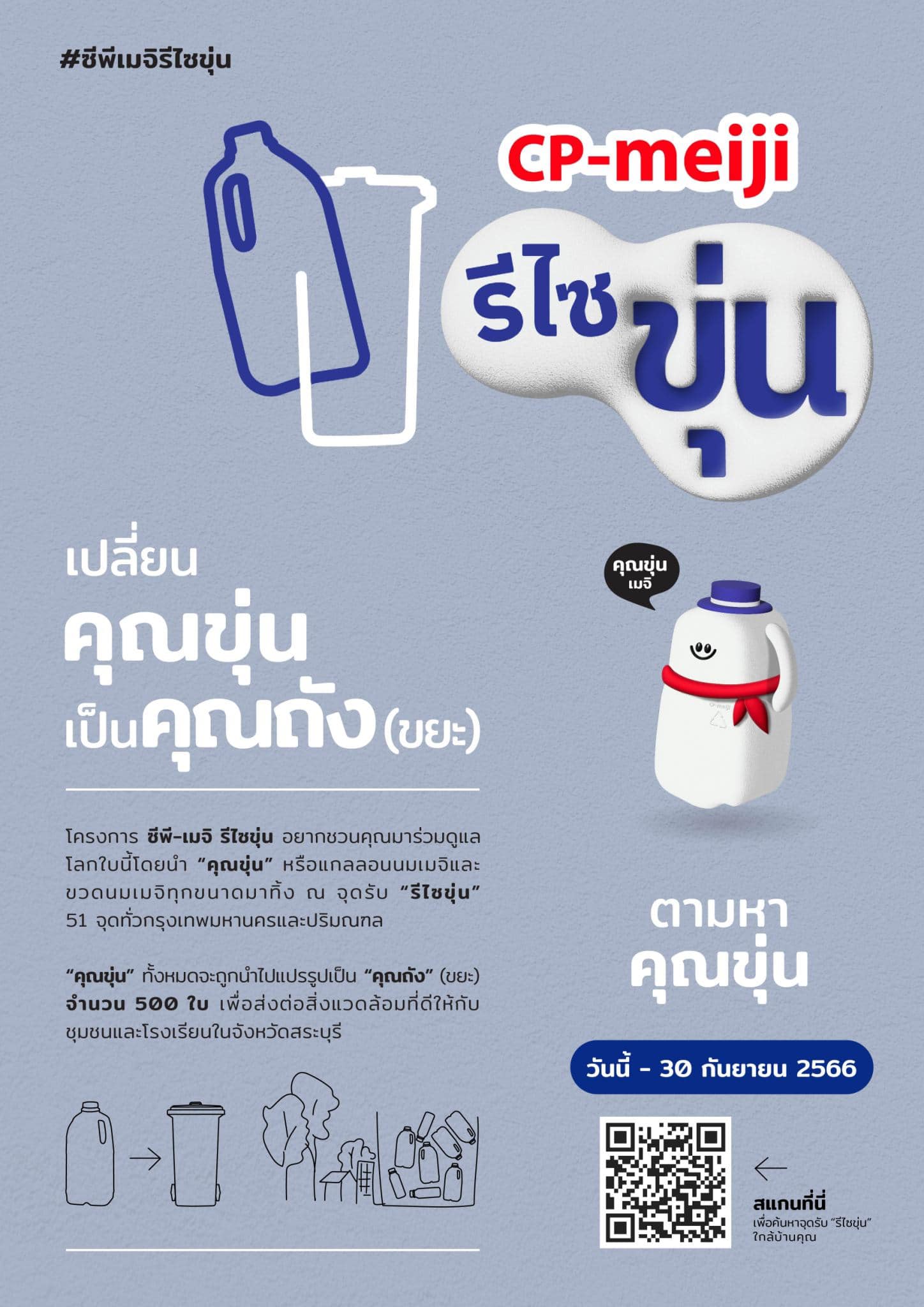 ซีพี-เมจิ ผู้นำอุตสาหกรรมนมพาสเจอร์ไรส์ของประเทศไทย ในกลุ่มบริษัท CPF เปิดตัวโครงการ “ซีพี-เมจิ รีไซขุ่น” ชวนผู้บริโภคส่งแกลลอนนมเมจิที่ใช้แล้ว ซึ่งเป็นพลาสติกแบบขุ่น (HPDE) นำกลับเข้าสู่กระบวนการรีไซเคิล เพื่อนำมาผลิตเป็น “ถังขยะ เพื่อแยกขยะ” จำนวน 500 ถัง มอบให้ จ.สระบุรี ปลายปี 2566
