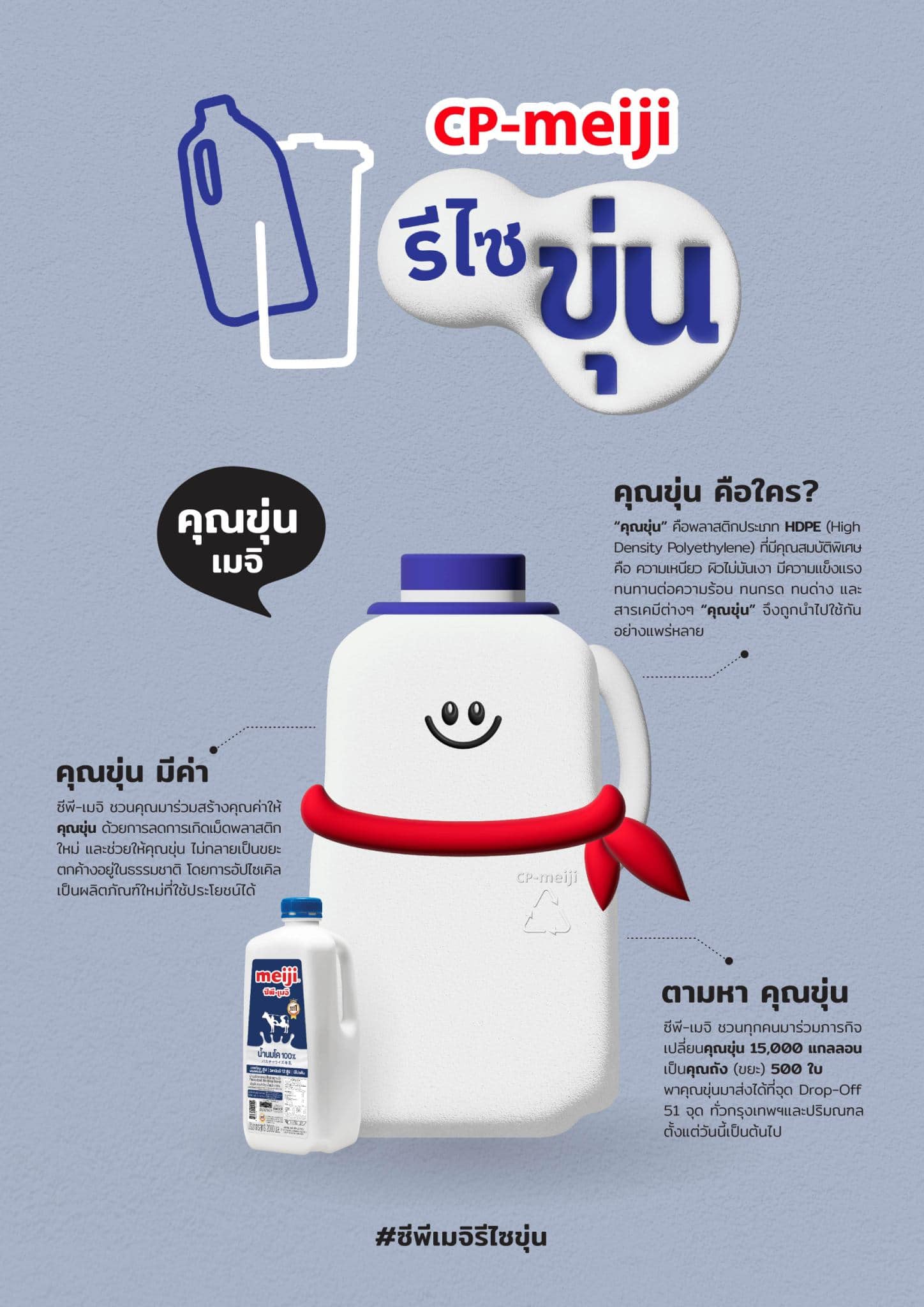 ซีพี-เมจิ ที่จัดโครงการดังกล่าวขึ้น เชื่อว่า จะสร้างการเปลี่ยนแปลงที่ดีขึ้นให้โลกของเรา และทุกคนสามารถมีส่วนร่วมได้ง่ายๆ ด้วยการแยกขยะอย่างถูกต้อง นำแกลลอนพลาสติกไปทิ้ง ณ จุดรับทิ้งของ CirPlas ซึ่งมีมากกว่า 60 จุด ทั่วกรุงเทพฯ และปริมณฑล บริษัทฯ จะเก็บและนำเข้าสู่กระบวนการรีไซเคิลเป็นเม็ดพลาสติกใหม่เพื่อผลิตเป็นถังขยะต่อไป ทั้งนี้ สามารถติดตามข้อมูลจุดรับทิ้งได้ที่ Facebook : CirPlas หรือ Line Official (@cirplas) หรือสังเกตเครื่องหมายแคมเปญ “ซีพี-เมจิ รีไซขุ่น” ได้ทุกจุดรับทิ้งแกลลอน