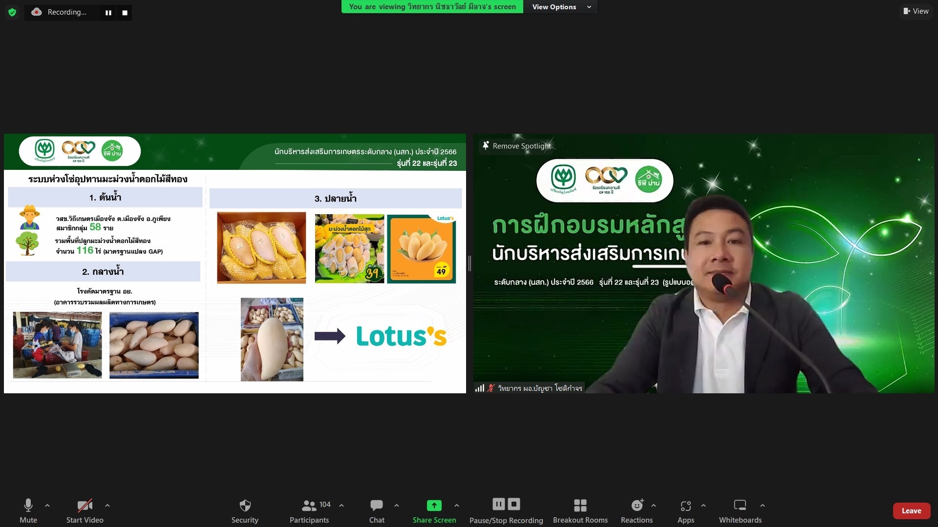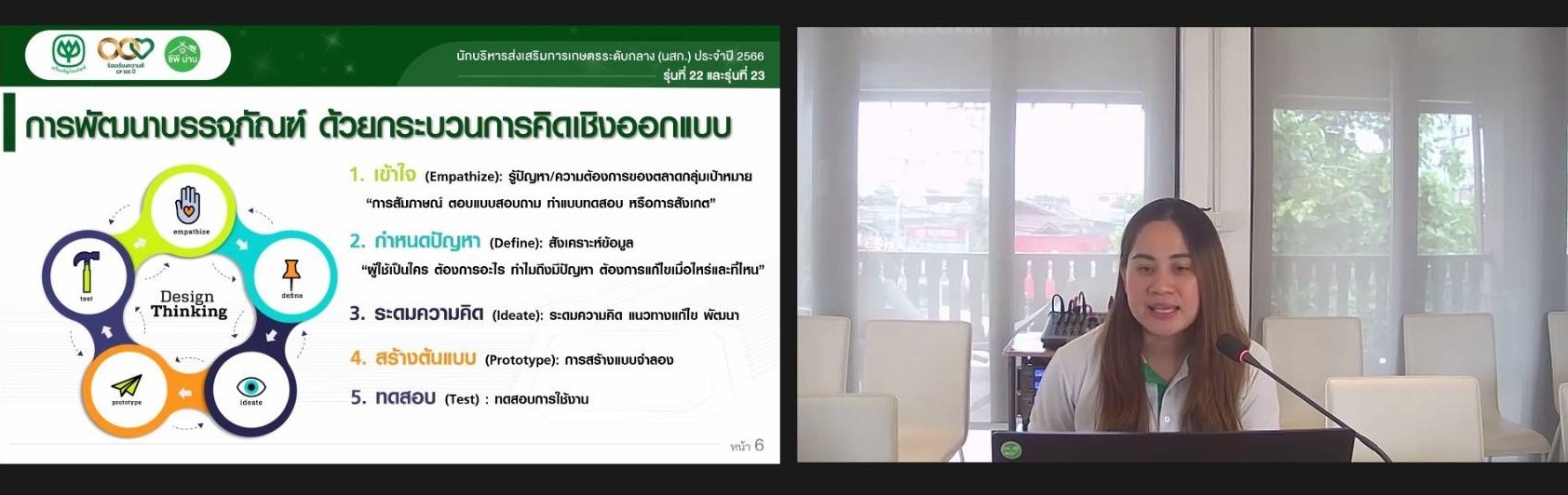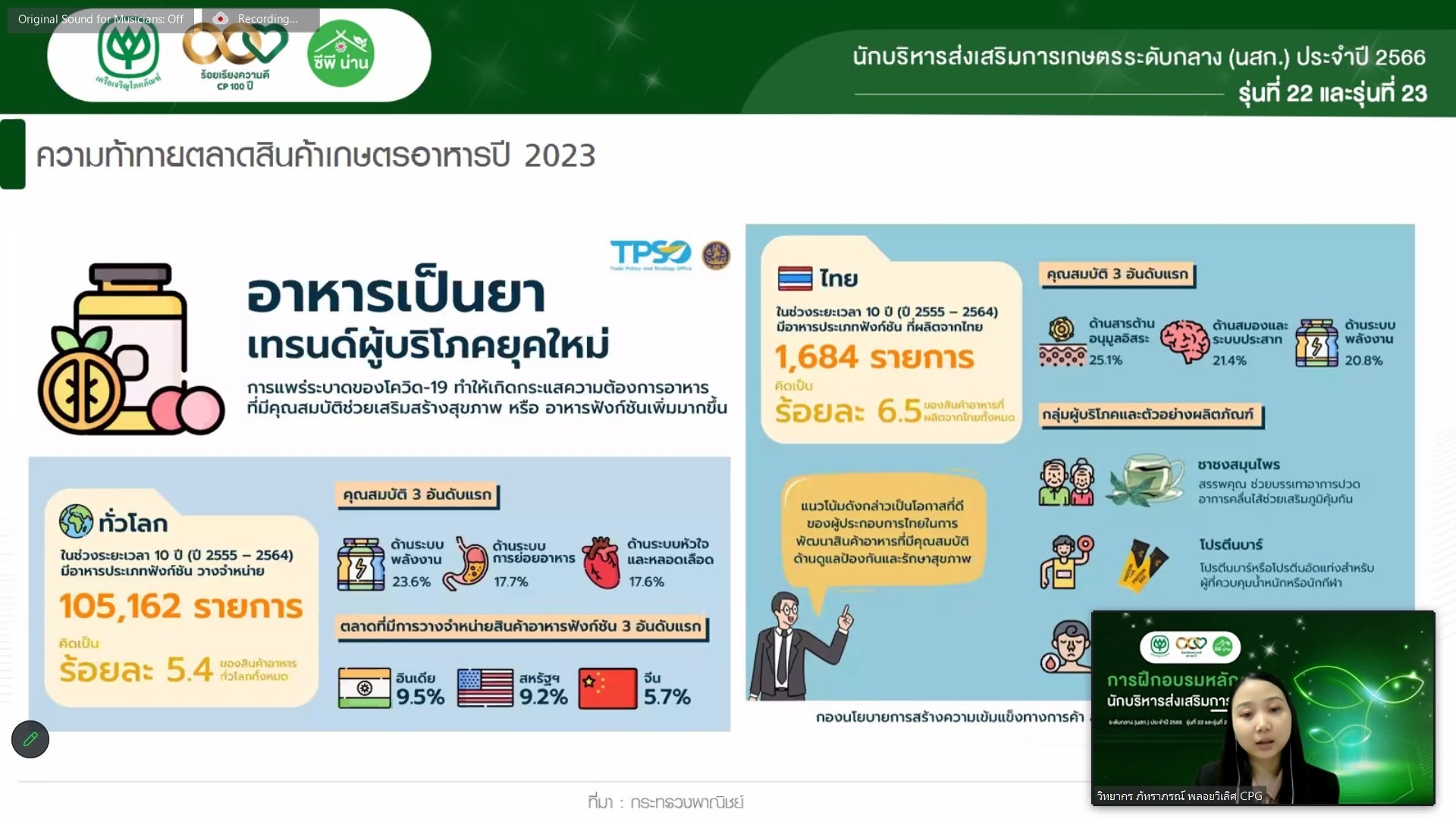 โดยบรรยายผ่านระบบออนไลน์ เพื่อพัฒนาศักยภาพบุคลากรทุกระดับให้มีประสิทธิภาพและความพร้อมต่อการพัฒนาท้องถิ่น มุ่งหวังให้ผู้นำที่จะก้าวเข้าสู่การเป็นนักบริหารส่งเสริมการเกษตร นำความรู้ไปถ่ายทอดและต่อยอดในการปฏิบัติงานด้านการเกษตรได้อย่างเป็นรูปธรรม รวมถึงสร้างเครือข่ายให้เกิดในวงกว้างและเป็นที่รับรู้ในเชิงประจักษ์ต่อบทบาทการดำเนินงาน ด้านการพัฒนาหลักสูตรและงานพัฒนาชุมชนของเครือเจริญโภคภัณฑ์ ผ่านหัวข้อ การจัดการระบบห่วงโซ่อุปทานสินค้าเกษตรและการวางแผนโมเดลธุรกิจเกษตร แนวทางการสร้างตลาดออนไลน์ และออฟไลน์ ด้วยเครื่องมือ เทคโนโลยี และนวัตกรรมที่ใช้ การแลกเปลี่ยนการดำเนินงานด้านพัฒนาชุมชน มิติการเชื่อมโยงตลาดสินค้าเกษตร และแนวคิดการออกแบบและพัฒนาบรรจุภัณฑ์ ด้วยกระบวนการคิดเชิงออกแบบ (Design Thinking)