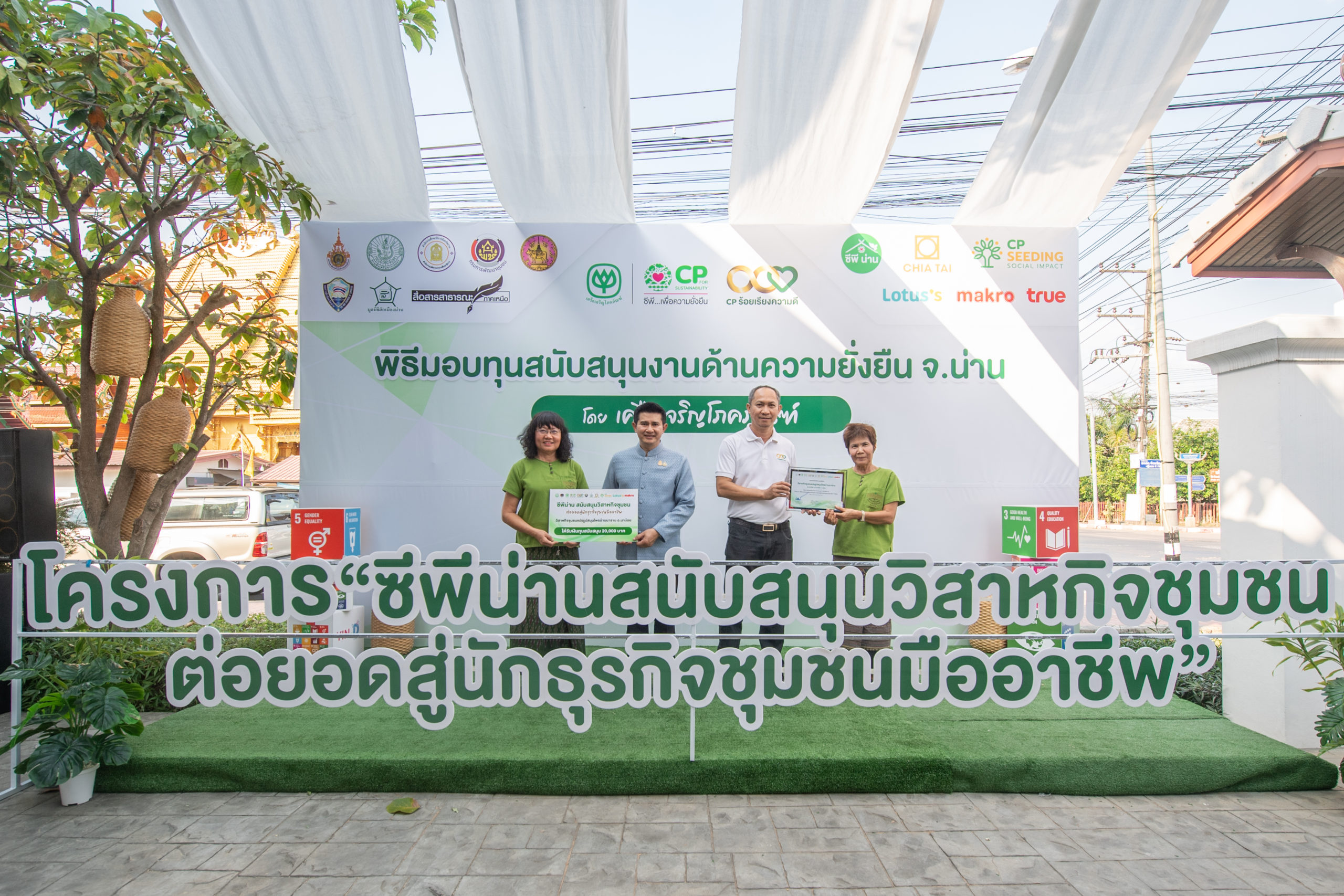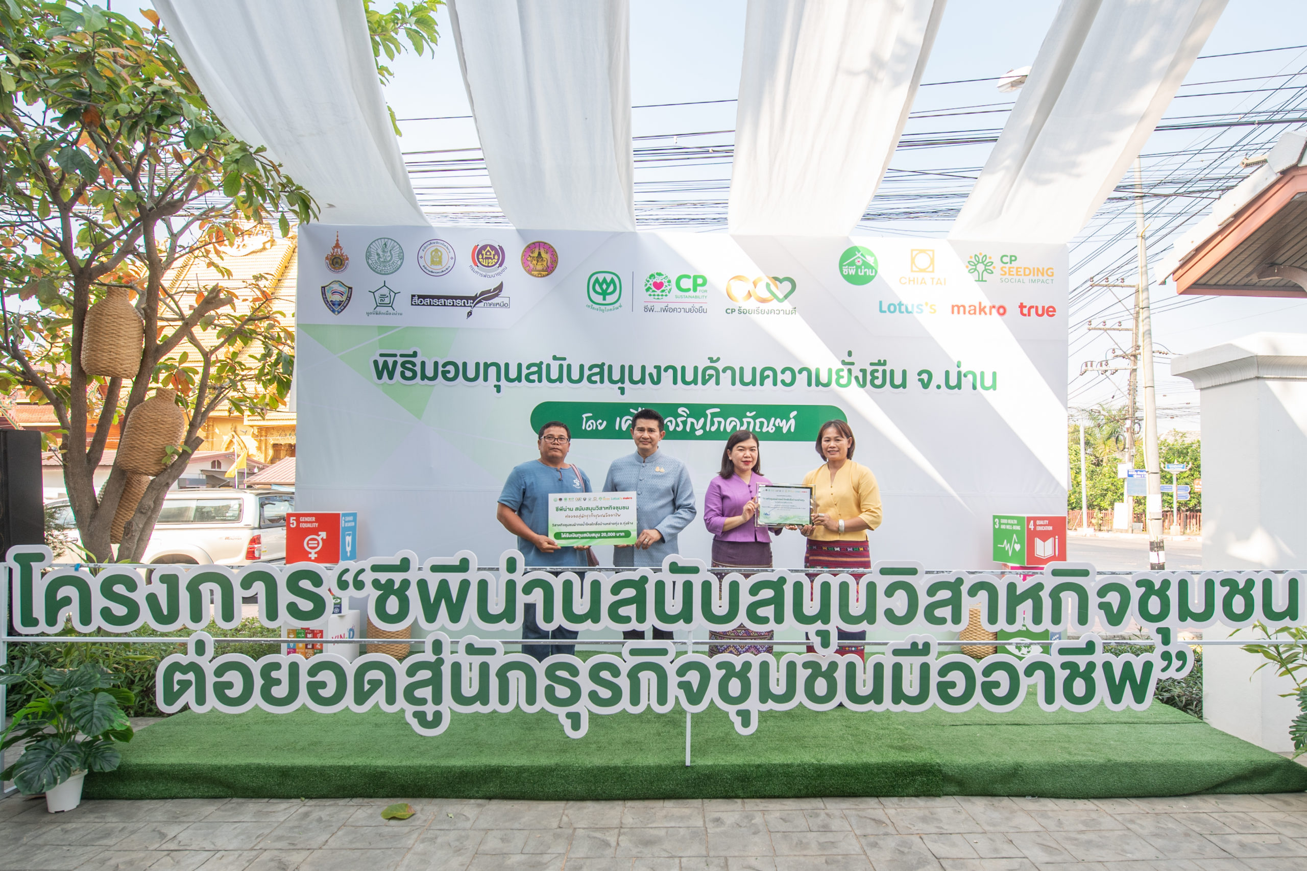 เมื่อวันที่ 23 กุมภาพันธ์ 2567 ที่ผ่านมา คุณชัยนรงค์ วงศ์ใหญ่ ผู้ว่าราชการจังหวัดน่าน ให้เกียรติเป็นประธานในพิธีมอบทุนสนับสนุนโครงการ “ซีพีน่านสนับสนุนวิสาหกิจชุมชน ต่อยอดสู่นักธุรกิจชุมชนมืออาชีพ” โดยมี คุณศรีรุ่ง รัตนศิลา ประธานหอการค้าจังหวัดน่าน คุณสำรวย ผัดผล ประธานมูลนิธิฮักเมืองน่าน และหน่วยงานภาคีเครือข่ายในพื้นที่ ได้แก่ สำนักงานเกษตรจังหวัดน่าน สำนักงานพัฒนาชุมชนจังหวัดน่าน สำนักงานเกษตรและสหกรณ์จังหวัดน่าน สำนักงานพาณิชย์จังหวัดน่าน สำนักงานประชาสัมพันธ์จังหวัดน่าน สถาบันวิจัยและพัฒนาพื้นที่สูง (องค์การมหาชน) กลุ่มงานโครงการพัฒนาพื้นที่สูงแบบโครงการหลวงลุ่มน้ำน่าน พร้อมด้วย คุณพิไลลักษณ์ พิชัยวัตต์ ผู้ช่วยกรรมการผู้จัดการ ด้านพัฒนาความยั่งยืนภาครัฐและกิจการสัมพันธ์ เครือเจริญโภคภัณฑ์ คุณบัญชา โชติกำจร ผู้อำนวยการ สำนักงานด้านความความยั่งยืนและพัฒนาชุมชน จ.น่าน เครือเจริญโภคภัณฑ์ และผู้แทนจากกลุ่มธุรกิจในเครือซีพี ได้แก่ บริษัท เจียไต๋ จำกัด บริษัท ซีพี แอ็กซ์ตร้า จำกัด (มหาชน) สาขาน่าน บริษัท ซีพี ออลล์ จํากัด (มหาชน) บริษัท เอก-ชัย ดิสทริบิวชั่น ซิสเทม จำกัด สาขาน่าน และ บริษัท ซีพี ซีดดิ้ง โซเชียลอิมแพคท์ จำกัด ร่วมมอบทุนสนับสนุน แก่วิสาหกิจชุมชน จำนวน 15 กลุ่ม ครอบคลุม 15 อำเภอในพื้นที่ จ.น่าน รวมจำนวนทั้งหมด 3 แสนบาท จัดขึ้น ณ สำนักงานด้านความความยั่งยืนและพัฒนาชุมชน จ.น่าน เครือเจริญโภคภัณฑ์