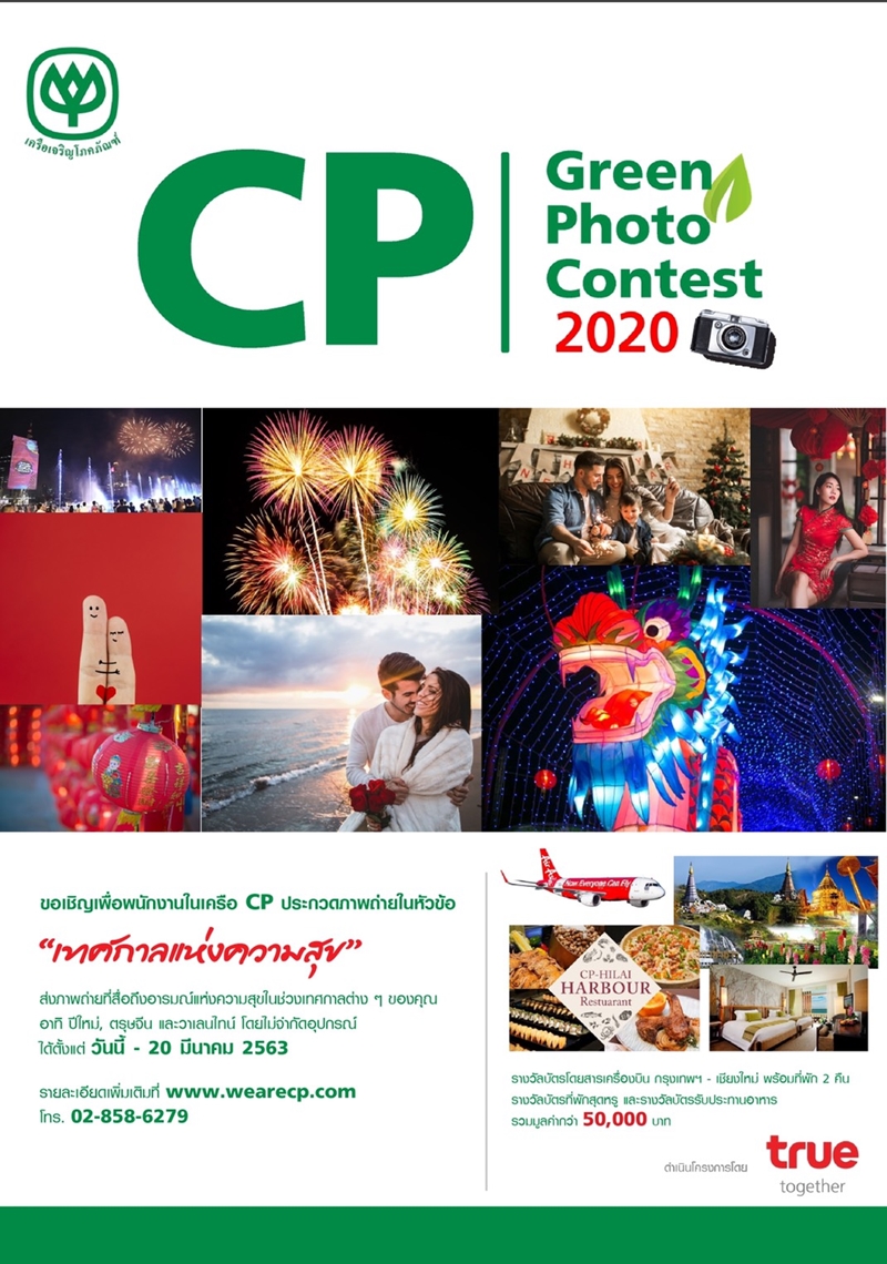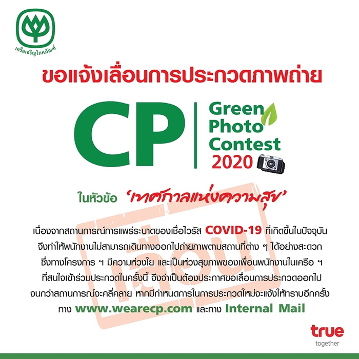 โครงการประกวดภาพถ่ายพนักงาน CP Green Photo ขอแจ้งเลื่อนการประกวดภาพถ่าย CP Green Photo Contest 2020 ครั้งที่ 1ในหัวข้อ ‘เทศกาลแห่งความสุข’ เนื่องจากสถานการณ์การแพร่ระบาดของเชื่อไวรัส COVID-19 ที่เกิดขึ้นในปัจจุบันจึงทำให้พนักงานไม่สามารถเดินทางออกไปถ่ายภาพตามสถา นที่ต่าง ๆ ได้อย่างสะดวกซึ่งทางโครงการ ฯ มีความห่วงใย และเป็นห่วงสุขภาพของเพื่อนพนักงานในเครือ ฯ ทุกคนที่สนใจส่งภาพถ่ายเข้าร่วมประกวดในครั้งนี้ จึงจำเป็นต้องประกาศขอเลื่อนการประกวดออกไปจนกว่าสถานการณ์จะคลี่คลาย หากมีกำหนดการในการประกวดใหม่จะแจ้งให้ทราบอีกครั้งทาง www.wearecp.com และทาง Internal Mail