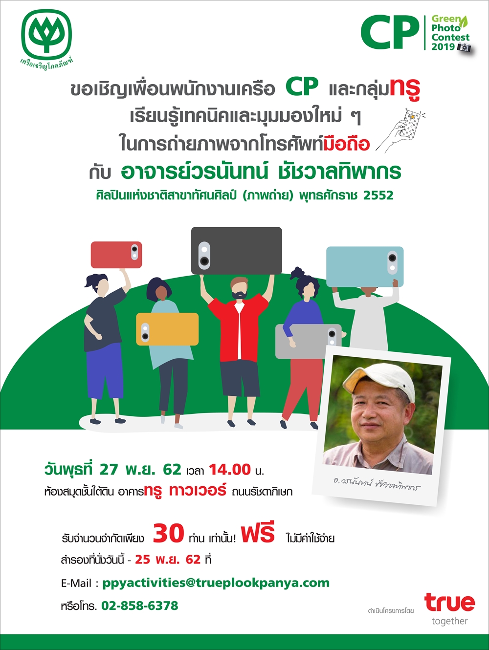 ชวนเพื่อนๆชาวซีพีที่สนใจการถ่ายภาพ ร่วมเรียนรู้เทคนิคและมุมมองการถ่ายภาพด้วยโทรศัพท์มือถือ กับ อาจารย์วรนันทน์ ชัชวาลทิพากร ศิลปินแห่งชาติสาขาภาพถ่าย
