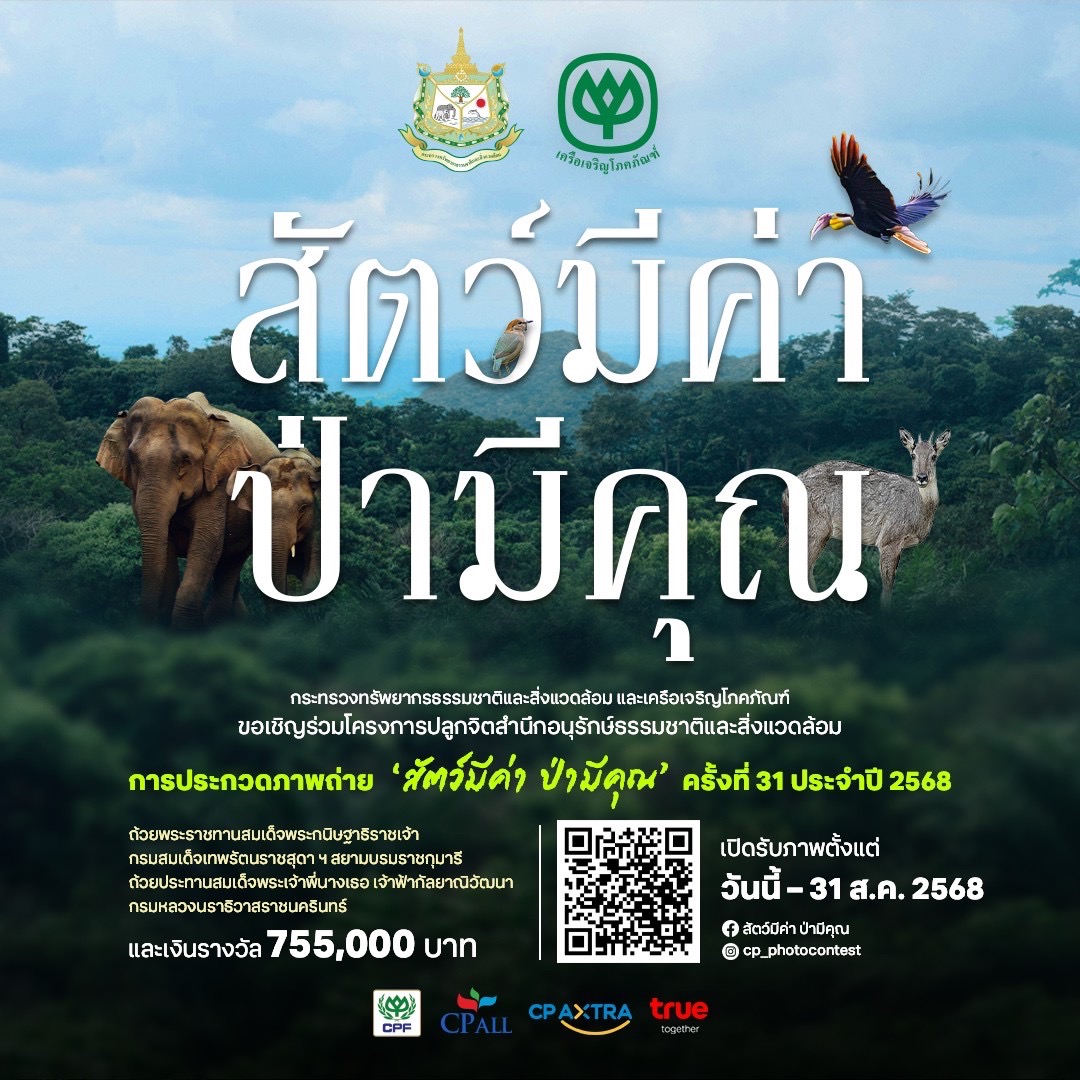 กรมอุทยานแห่งชาติ สัตว์ป่า และพันธุ์พืช ร่วมกับ เครือเจริญโภคภัณฑ์ พร้อมด้วยบริษัทในเครือ ฯ ได้แก่ บมจ.เจริญโภคภัณฑ์อาหาร (CPF) บมจ.ซีพี ออลล์ (CPALL) บมจ.ซีพี แอ็กซ์ตร้า (CP AXTRA) ธุรกิจแม็คโคร และโลตัส (Makro – Lotus’s) และบมจ. ทรู คอร์ปอเรชั่น (TRUE) สานต่อโครงการปลูกจิตสำนึกอนุรักษ์ธรรมชาติและสิ่งแวดล้อม การประกวดภาพถ่าย “สัตว์มีค่า ป่ามีคุณ” ประจำปี 2568 ต่อเนื่องเป็นปีที่ 25 เชิญชวนประกวดภาพถ่ายอนุรักษ์ธรรมชาติ เพื่อให้ชาวไทยได้เข้าไปสัมผัสความงดงามของธรรมชาติ ป่าไม้ และสัตว์ป่า ในประเทศไทย เพื่อนำความสมบูรณ์งดงามมาถ่ายทอดผ่านภาพถ่ายให้ได้ร่วมชื่นชม จนเกิดความรัก หวงแหน อยากปกป้องรักษาให้คงอยู่อย่างยั่งยืนตลอดไป พร้อมชิงถ้วยพระราชทานสมเด็จพระกนิษฐาธิราชเจ้า กรมสมเด็จพระเทพรัตนราชสุดา ฯ สยามบรมราชกุมารี และถ้วยประทานสมเด็จพระเจ้าพี่นางเธอ เจ้าฟ้ากัลยาณิวัฒนา กรมหลวงนราธิวาสราชนครินทร์ นอกจากนี้ ทุกรางวัลจะได้รับสิทธ์ท่องเที่ยวในอุทยานแห่งชาติฯ หรือเขตรักษาพันธุ์สัตว์ป่า พร้อมที่พักจากกรมอุทยานแห่งชาติ สัตว์ป่า และพันธุ์พืช อีกด้วย รวมมูลค่ารางวัลทั้งสิ้น 755,000 บาท