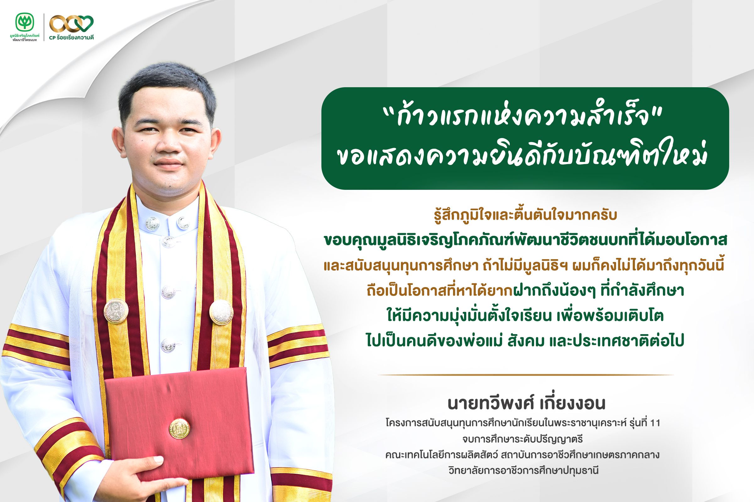 เมื่อเร็ว ๆ นี้ มูลนิธิเจริญโภคภัณฑ์พัฒนาชีวิตชนบท ร่วมแสดงความยินดีกับ นายทวีพงศ์ เกี่ยงงอน นักเรียนทุนฯ โครงการสนับสนุนทุนการศึกษานักเรียนในพระราชานุเคราะห์ รุ่นที่ 11 เข้ารับปริญญาบัตรจบการศึกษาระดับปริญญาตรี คณะเทคโนโลยีการผลิตสัตว์ สถาบันการอาชีวศึกษาเกษตรภาคกลาง ณ วิทยาลัยการอาชีวการศึกษาปทุมธานี จ.ปทุมธานี