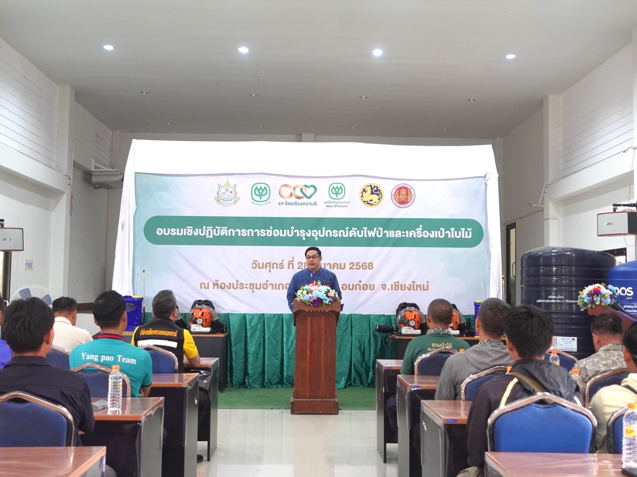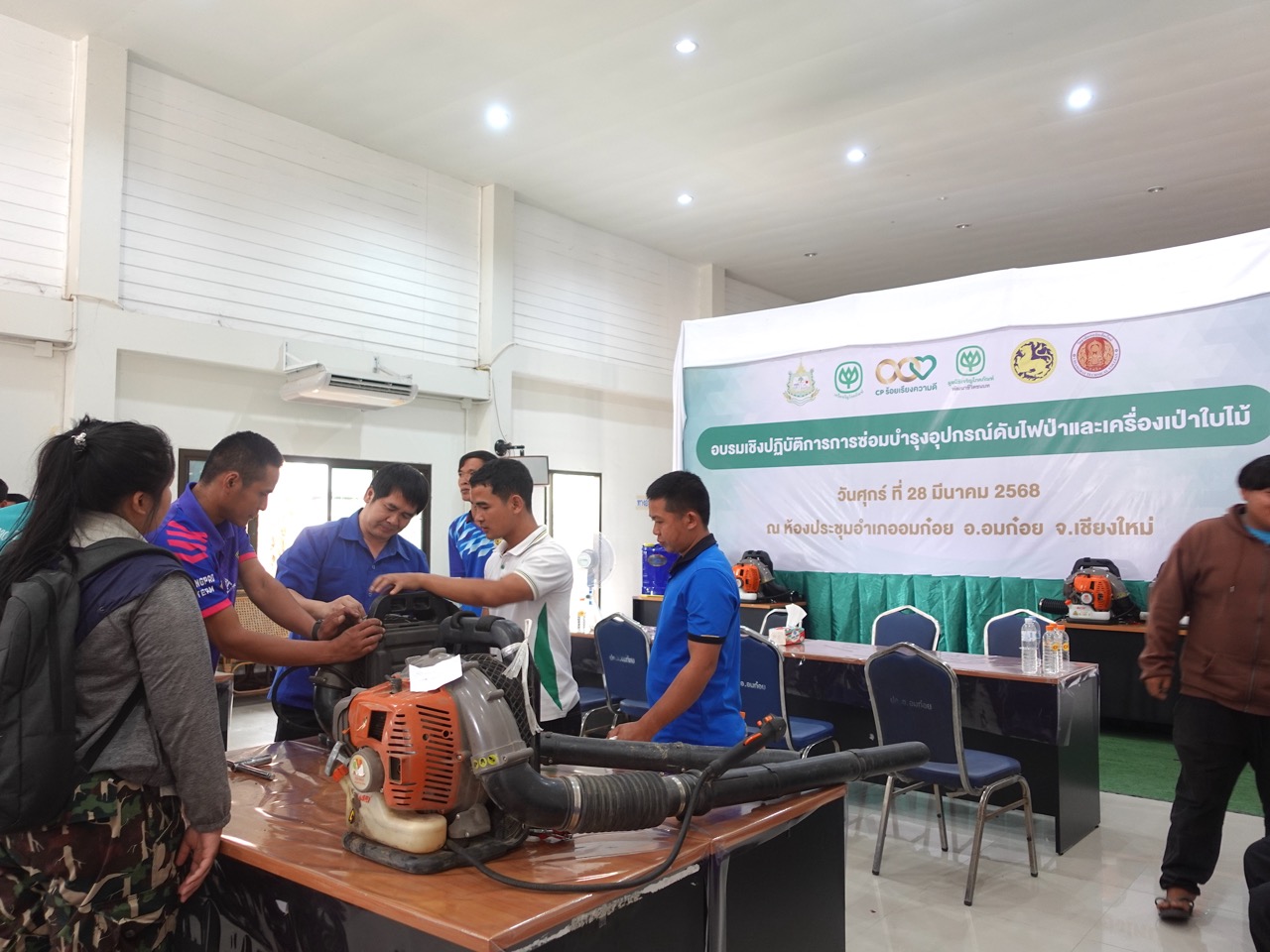 คุณชุมพลภัทร์ คงธนจารุอนันต์ ผู้จัดการสำนักปกป้องและฟื้นฟูสิ่งแวดล้อม ฝ่ายปฏิบัติการเพื่อสังคม มูลนิธิเจริญโภคภัณฑ์พัฒนาชีวิตชนบท เปิดเผยว่า เมื่อเดือนกุมภาพันธ์ 2568 เครือซีพี ได้มอบกองทุนประกันและอุปกรณ์ดับไฟป่าให้กับอาสาสมัครในจังหวัดเชียงใหม่ มูลนิธิฯ ภายใต้โครงการอมก๋อยโมเดล ซึ่งปฏิบัติงานด้านความยั่งยืนในพื้นที่ ได้จัดงาน “อบรมเชิงปฏิบัติการการซ่อมบำรุงอุปกรณ์ดับไฟป่าและเครื่องเป่าใบไม้” ขึ้น เพื่อมุ่งเน้นให้ผู้เข้ารับการอบรมมีความรู้ความเข้าใจในการซ่อมบำรุงเบื้องต้น เพื่อยืดอายุการใช้งาน นอกจากนี้ยังเล็งเห็นว่า การใช้งานอุปกรณ์ดับไฟป่าและเครื่องเป่าใบไม้อย่างต่อเนื่องในสภาพแวดล้อมที่สมบุกสมบัน อาจทำให้เกิดการสึกหรอและเสียหายได้ ภารกิจดับไฟป่าเป็นงานที่หนักและเสี่ยงภัยอย่างยิ่ง อุปกรณ์จึงเป็นเครื่องมือสำคัญที่ต้องมีประสิทธิภาพพร้อมใช้งานอยู่เสมอเพื่อเพิ่มประสิทธิภาพในการปฏิบัติงานของอาสาสมัครดับไฟป่า โดยได้รับความอนุเคราะห์วิทยากรผู้เชี่ยวชาญจาก แผนกวิชาช่างยนต์ โครงการพิเศษและบริการชุมชน วิทยาลัยเทคนิคเชียงใหม่ มาถ่ายทอดความรู้และฝึกปฏิบัติอย่างเข้มข้น