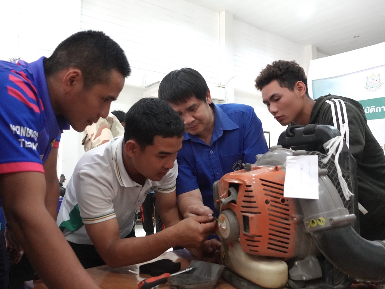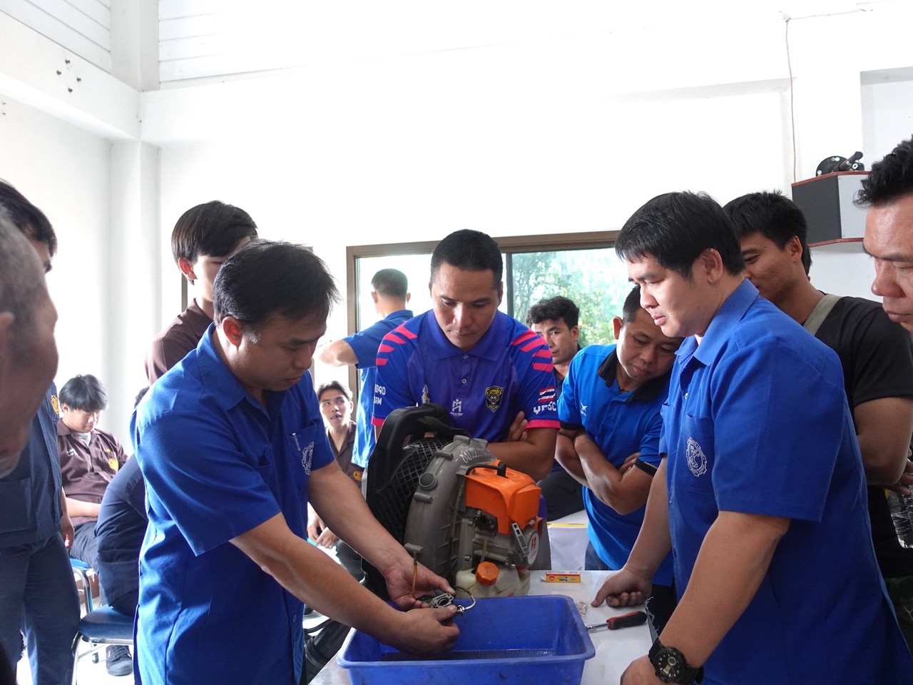 โดยมีการบรรยายเกี่ยวกับการซ่อมบำรุงอุปกรณ์ดับไฟป่าและเครื่องเป่าใบไม้ การวิเคราะห์ปัญหาที่พบบ่อยและการแลกเปลี่ยนประสบการณ์ในการดูแลรักษาอุปกรณ์ การฝึกแก้ไขปัญหาเบื้องต้น เช่น การเปลี่ยนหัวเทียนและการปรับแต่งคาร์บูเรเตอร์ การฝึกปฏิบัติการซ่อมบำรุงอุปกรณ์จริง ตั้งแต่การตรวจสอบสภาพทั่วไป การทำความสะอาด การเปลี่ยนชิ้นส่วนที่สึกหรอ การตรวจสอบและเปลี่ยนถ่ายน้ำมันเครื่อง รวมถึงการถอดและประกอบชิ้นส่วนต่างๆ โดยผลจากการอบรมเชิงปฏิบัติการในครั้งนี้เป็นที่น่าพอใจอย่างยิ่ง โดยสามารถซ่อมบำรุงเครื่องเป่าใบไม้ที่เข้าร่วมอบรมได้ถึง 15 เครื่อง จากทั้งหมด 17 เครื่อง ทำให้มีอุปกรณ์ที่พร้อมใช้งานเพิ่มขึ้นอย่างมาก