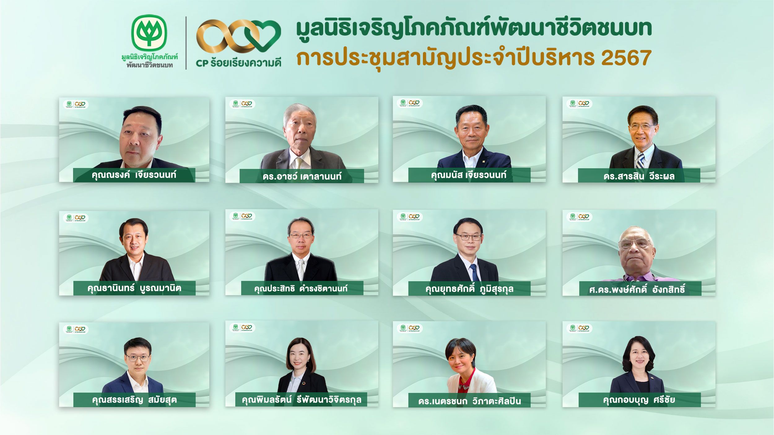 24 ตุลาคม 2567 – มูลนิธิเจริญโภคภัณฑ์พัฒนาชีวิตชนบท จัดประชุมสามัญประจำปีบริหาร 2567 โดย พลอากาศเอก ชลิต พุกผาสุข องคมนตรี ในฐานะประธานกรรมการมูลนิธิเจริญโภคภัณฑ์พัฒนาชีวิตชนบท คุณสุภกิต เจียรวนนท์ ประธานกรรมการ เครือเจริญโภคภัณฑ์ และ คุณศุภชัย เจียรวนนท์ ประธานคณะผู้บริหาร เครือเจริญโภคภัณฑ์ ในฐานะรองประธานกรรมการมูลนิธิฯ พร้อมด้วย ดร.อาชว์ เตาลานนท์ รองประธานอาวุโส เครือเจริญโภคภัณฑ์ คุณอดิเรก ศรีประทักษ์ รองประธานอาวุโส เครือเจริญโภคภัณฑ์ คุณณรงค์ เจียรวนนท์ รองประธานอาวุโส เครือเจริญโภคภัณฑ์ และผู้บริหารระดับสูงของกลุ่มบริษัทในเครือเจริญโภคภัณฑ์ รวม 23 ท่าน ณ ห้องบอร์ดรูม ชั้น 34 อาคารทรู ทาวเวอร์ ถนนรัชดาภิเษก