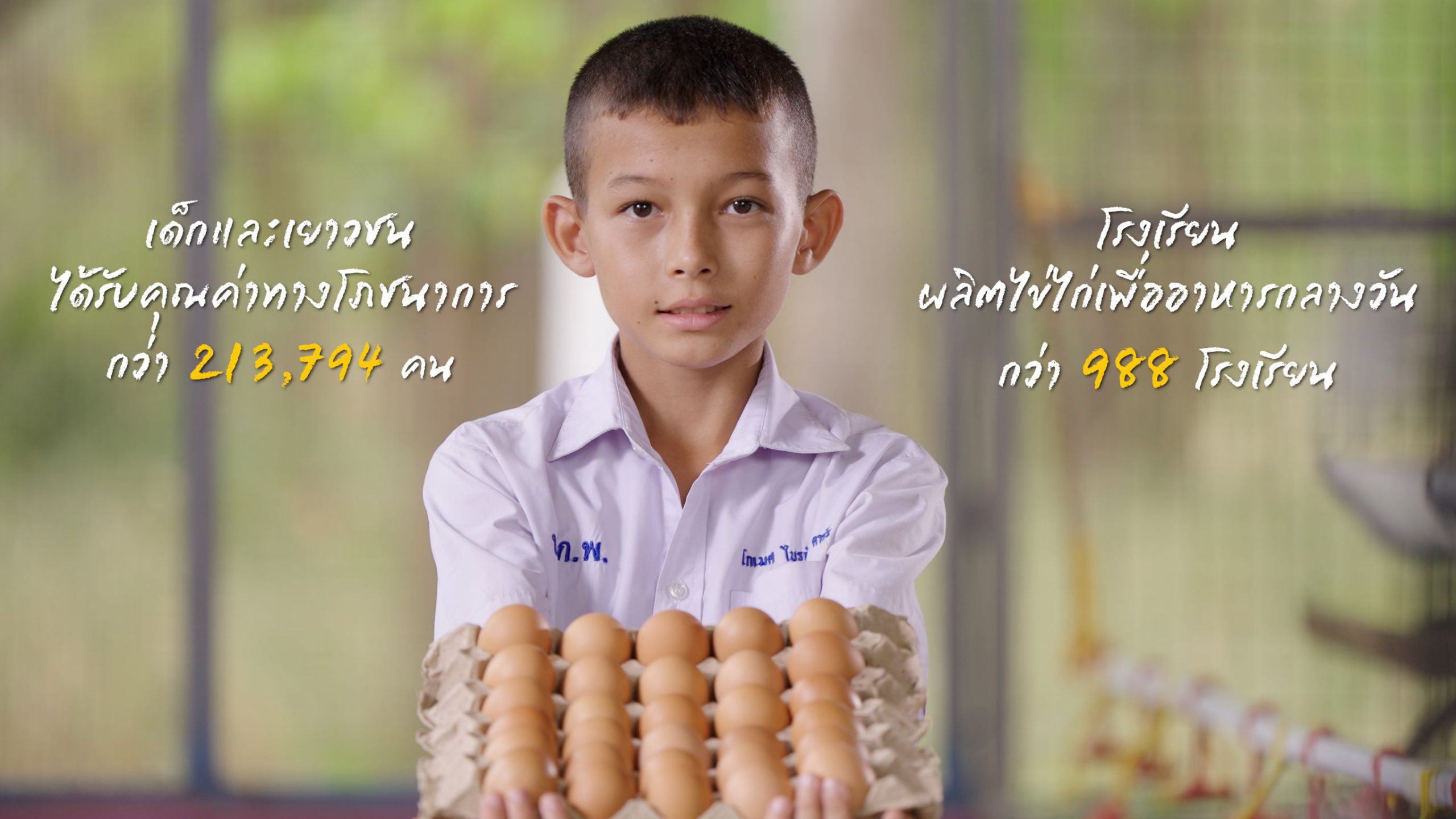 ปัจจุบันมีโรงเรียนเข้าร่วมโครงการเลี้ยงไก่ไข่เพื่ออาหารกลางวันแล้ว 959 โรงเรียน มีเด็กและเยาวชนได้รับคุณค่าทางโภชนาการกว่า 170,000 คน และผลิตไข่ไก่เพื่อบริโภคแล้วจำนวน 26 ล้านฟองต่อปี