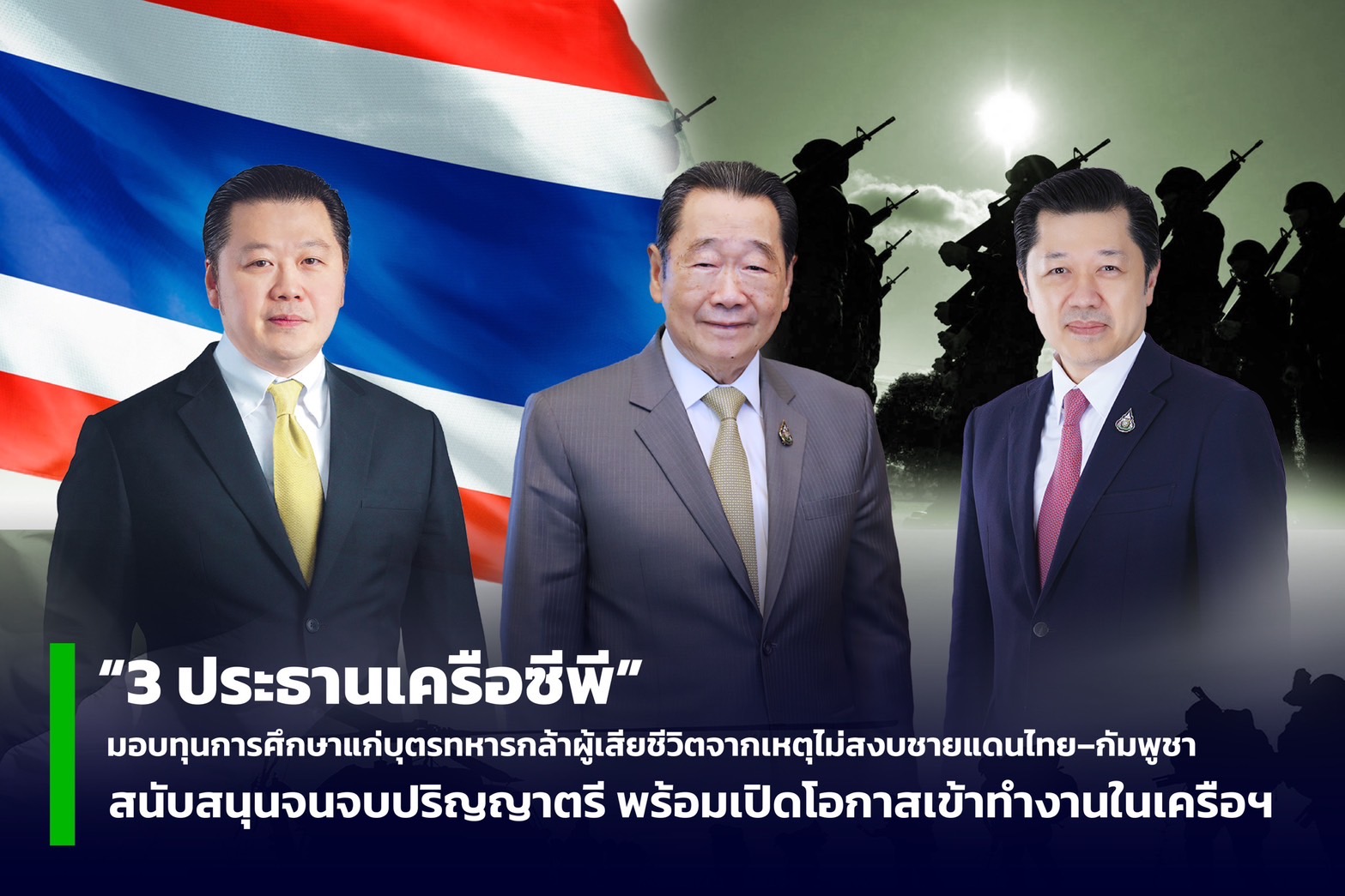 กรุงเทพฯ, 4 สิงหาคม 2568 – เครือเจริญโภคภัณฑ์ หรือซีพี ร้อยเรียงความดีสู่ประเทศชาติและสังคม เดินหน้าสานต่อค่านิยมองค์กร “สามประโยชน์” ประกาศมอบทุนการศึกษาและค่าครองชีพแก่บุตรและบุตรีของทหารกล้า ที่เสียชีวิตจากเหตุการณ์ความไม่สงบบริเวณชายแดนไทย–กัมพูชา เพื่อสนับสนุนให้เยาวชนเหล่านี้ได้เรียนจนจบระดับปริญญาตรี พร้อมเปิดโอกาสให้เข้าทำงานในบริษัทในเครือ