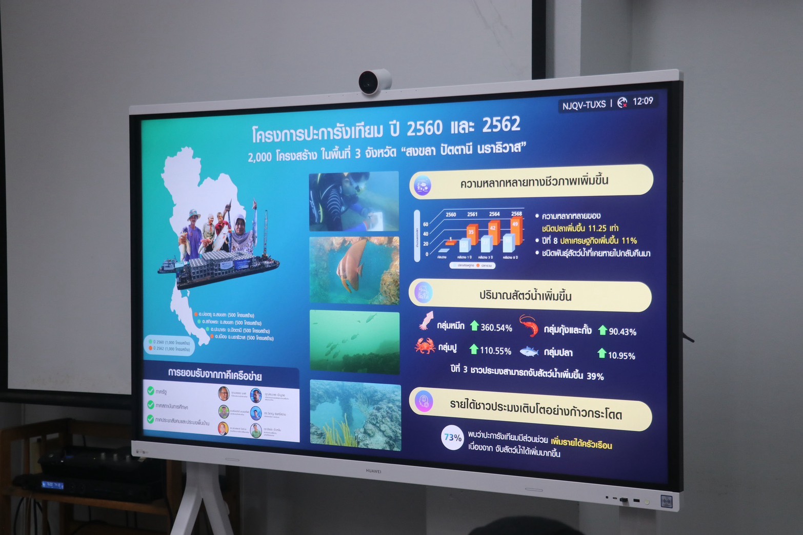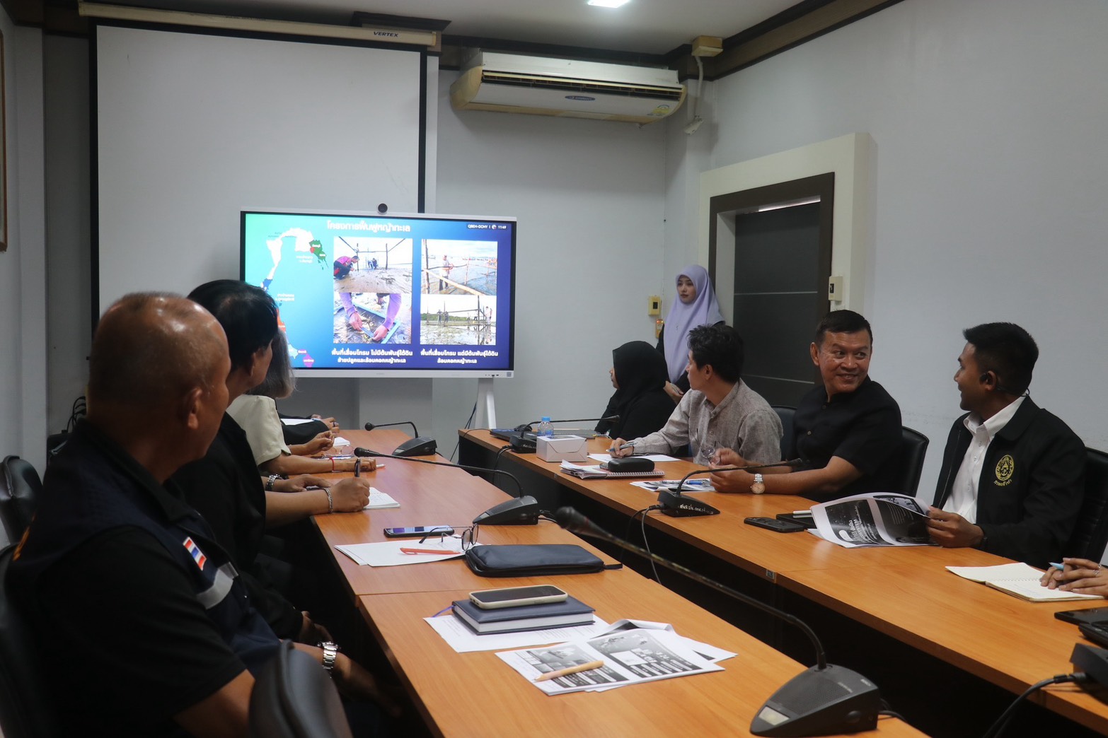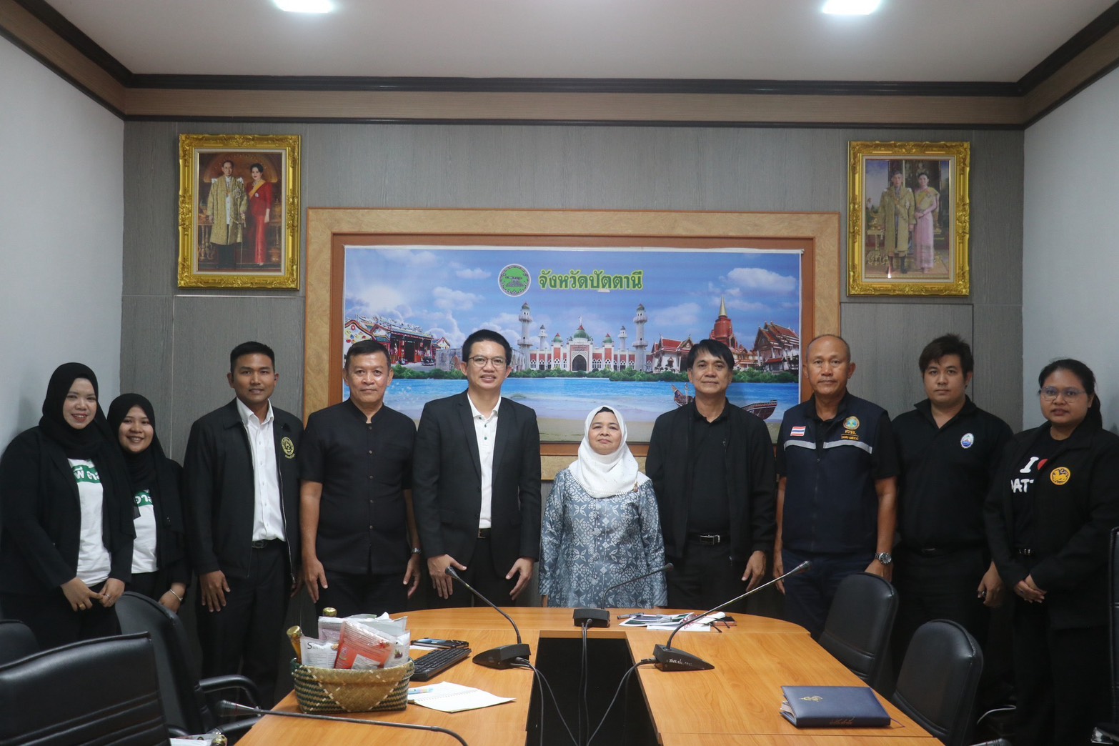 นางพาตีเมาะ สะดียามู ผู้ว่าราชการจังหวัดปัตตานี และ ดร.ปฐพร เกื้อนุ้ย ผู้จัดการฝ่าย หน่วยงาน ด้านพัฒนาความยั่งยืนภาครัฐและกิจการสัมพันธ์ เครือเจริญโภคภัณฑ์พร้อมคณะผู้เชี่ยวชาญ ร่วมกันหารือแนวทางการขับเคลื่อนภารกิจด้านการอนุรักษ์และฟื้นฟูระบบนิเวศทางทะเล ภายใต้โครงการ “ทะเลไทยยั่งยืน CP SEACOSYSTEM”