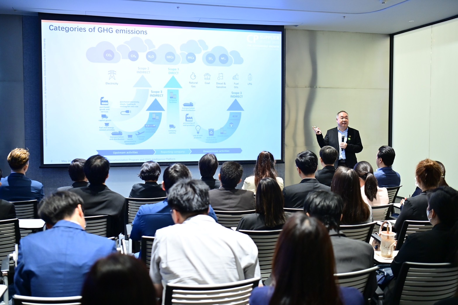 คุณเมธีระ เสรีรัชวัชระ รองผู้อำนวยการ สำนักบริหารความยั่งยืน ธรรมาภิบาล และสื่อสารองค์กร เครือเจริญโภคภัณฑ์ กล่าวถึง เครือซีพีมีธุรกิจมีการวางแนวทางแผนการลดการปล่อยก๊าซเรือนกระจกตลอดห่วงโซ่อุปทานตั้งแต่ต้นน้ำยันปลายน้ำอย่างชัดเจน ซึ่งคู่ค้ามีส่วนสำคัญอย่างมากในการร่วมมือกับเครือซีพีและธุรกิจในเครือฯ เพื่อผลักดันสู่ Net Zero เช่น การตรวจสอบย้อนกลับการรับซื้อข้าวโพดเลี้ยงสัตว์ที่จะต้องไม่มาจากการเผาป่า ขณะเดียวกันยังรวมไปถึงสินค้าที่วางจำหน่ายจะต้องเป็น Low-carbon footprint products เช่น การทำข้าวคาร์บอนต่ำ ซึ่งทางเครือซีพีและบริษัทในเครือฯ พร้อมสนับสนุนและพัฒนาสินค้าและบรรจุภัณฑ์ที่เป็นมิตรกับสิ่งแวดล้อมให้กับคู่ค้า ขณะเดียวกันเครือซีพีได้เปิดแพลตฟอร์มดิจิทัล Data Collection เพื่อวัดการปล่อยคาร์บอนและเก็บข้อมูลเป็นรายงานที่มีความถูกต้องโปร่งใสและสามารถนำข้อมูลนี้ส่งภาครัฐได้ โดยเครือฯ จะเปิดเทรนนิ่งให้กับคู่ค้า รวมไปถึงเป็นพี่เลี้ยงในการพัฒนากรีนโปรดักส์ ตั้งรับการแข่งขันทางการค้าและเทรนด์โลก ทั้งนี้เครือซีพีและบริษัทในเครือฯ พร้อมจับมือกับคู่ค้าพันธมิตรธุรกิจตั้งเป้าหมายในการลดการปล่อยก๊าซเรือนกระจกไปด้วยกัน เพื่อให้ธุรกิจเติบโตอย่างยั่งยืนร่วมกัน