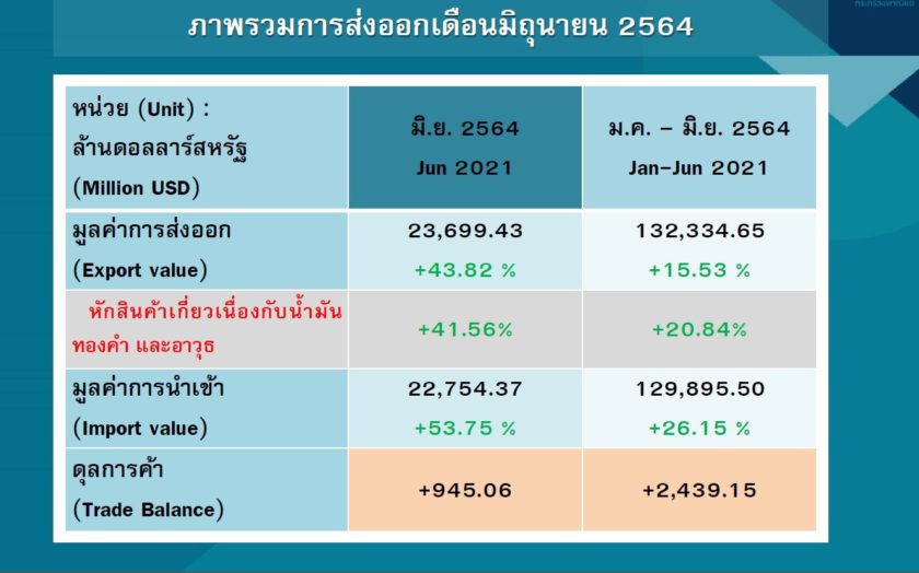 ภาพรวมการส่งออกครึ่งปีแรกของปี 2564 (มกราคม-มิถุนายน)