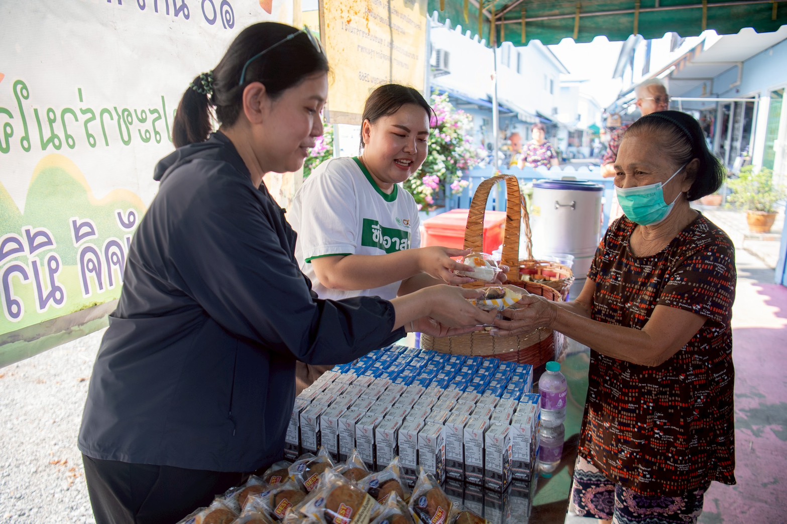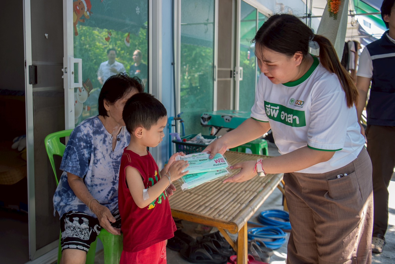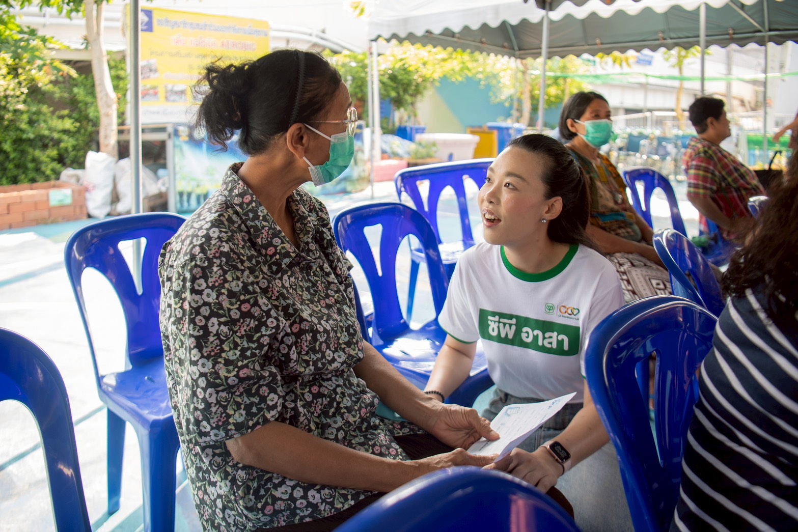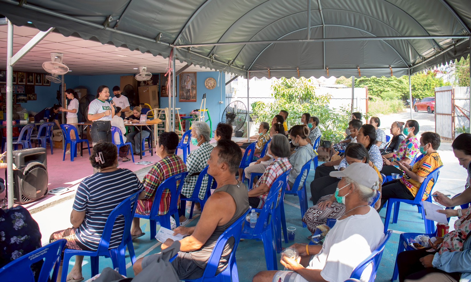 บรรยากาศ ณ ลานกิจกรรมชุมชนเต็มไปด้วยความอบอุ่น มูลนิธิซีพี นำพนักงานเหล่า “ซีพีอาสา” และมูลนิธิเส้นด้าย ได้จัดกิจกรรมตรวจคัดกรองสุขภาพเบื้องต้นให้แก่ผู้สูงอายุในชุมชนกว่า 40 คน เพื่อเป็นการเฝ้าระวังและส่งเสริมสุขภาวะที่ดีเชิงรุก นอกจากนี้ คณะผู้บริหารและทีมจิตอาสายังได้เดินเท้าเข้าสู่ตัวชุมชนเพื่อเยี่ยมบ้านผู้ป่วยและกลุ่มเประบาง พร้อมมอบรถเข็นวีลแชร์และอุปกรณ์ที่จำเป็น เพื่อให้การใช้ชีวิตสะดวกและปลอดภัยยิ่งขึ้น