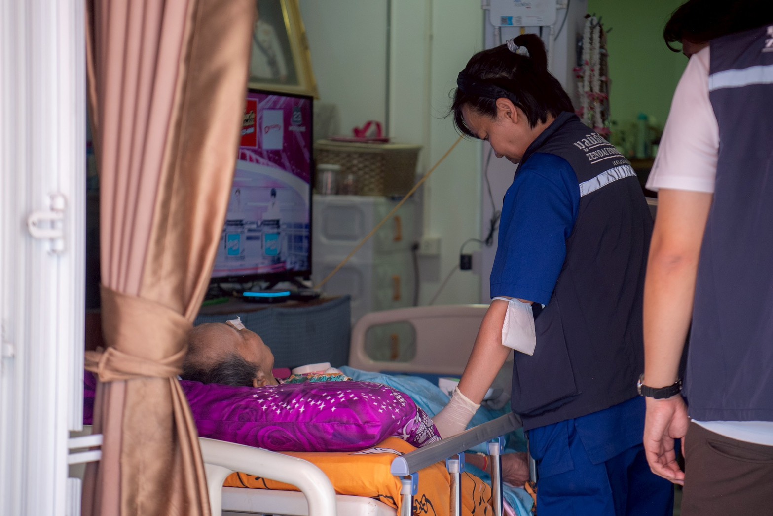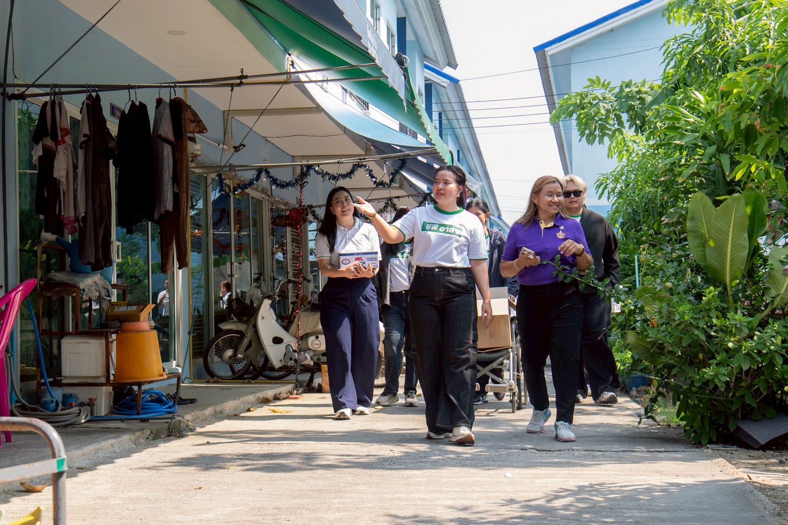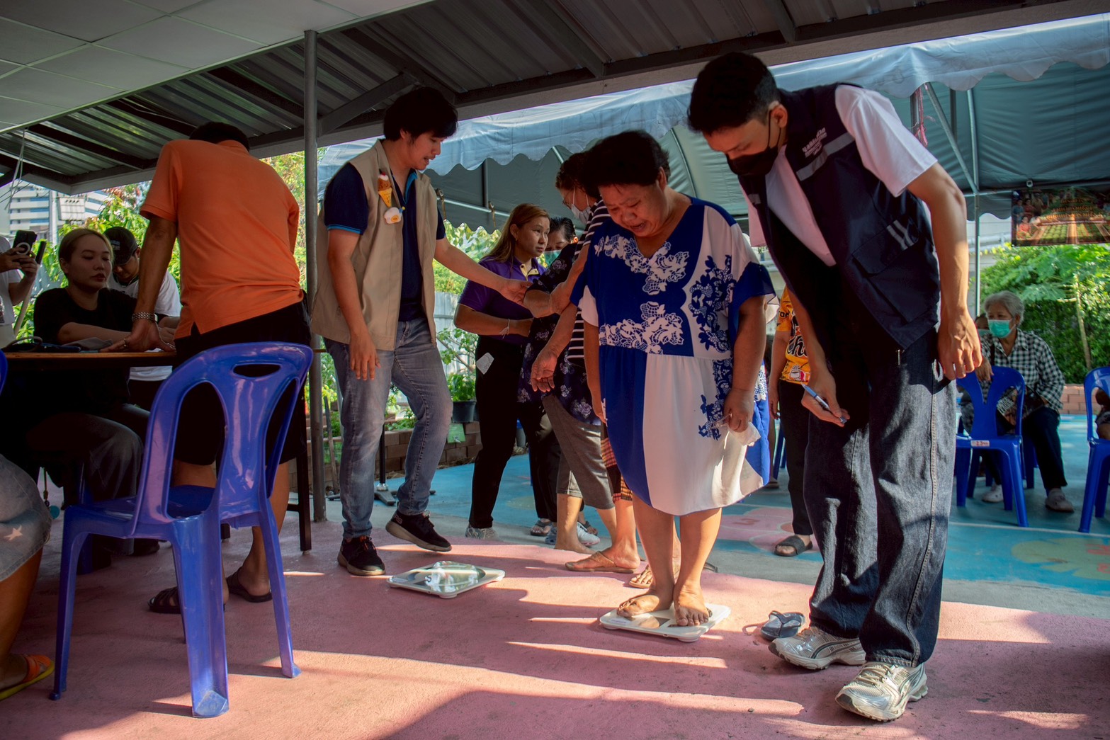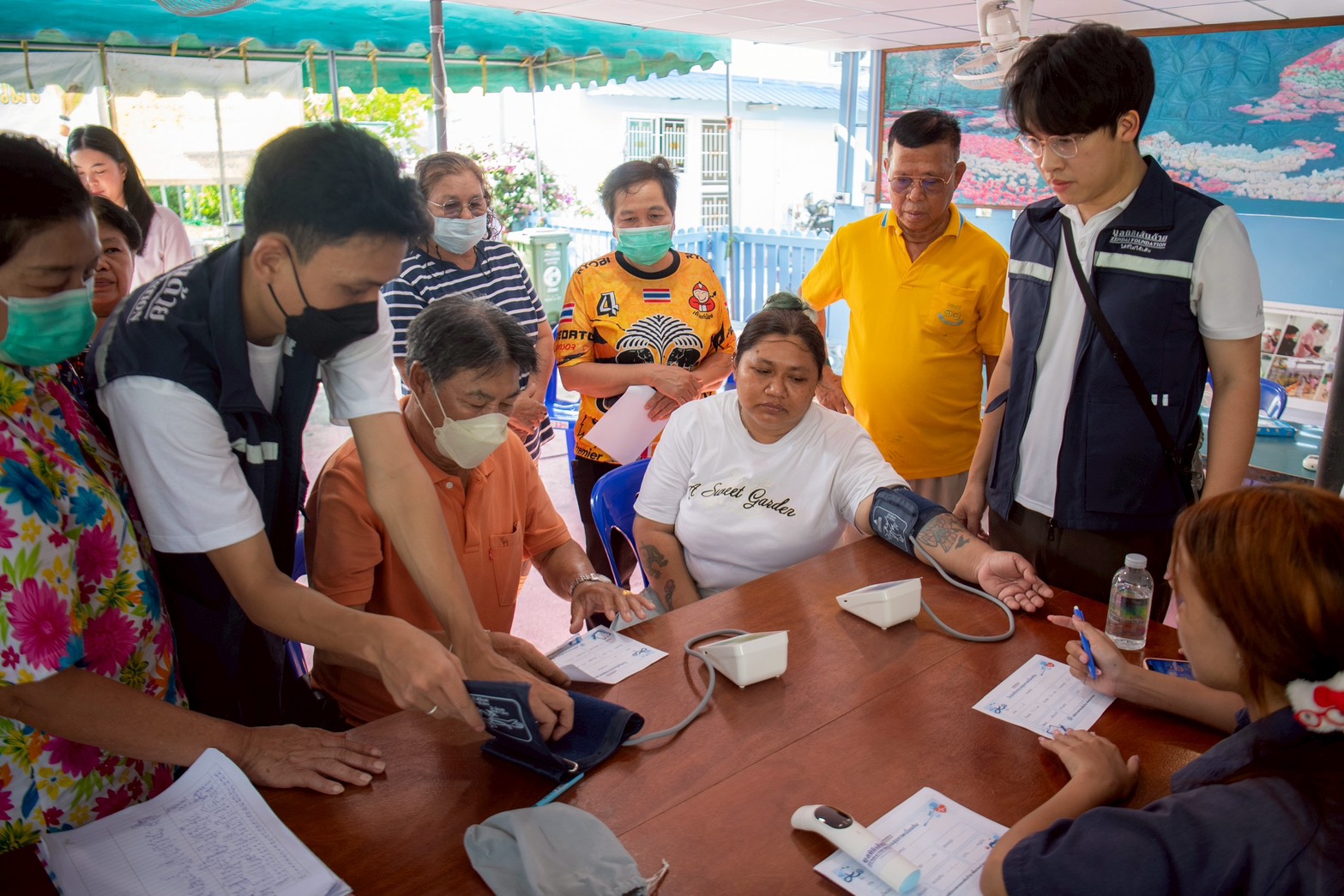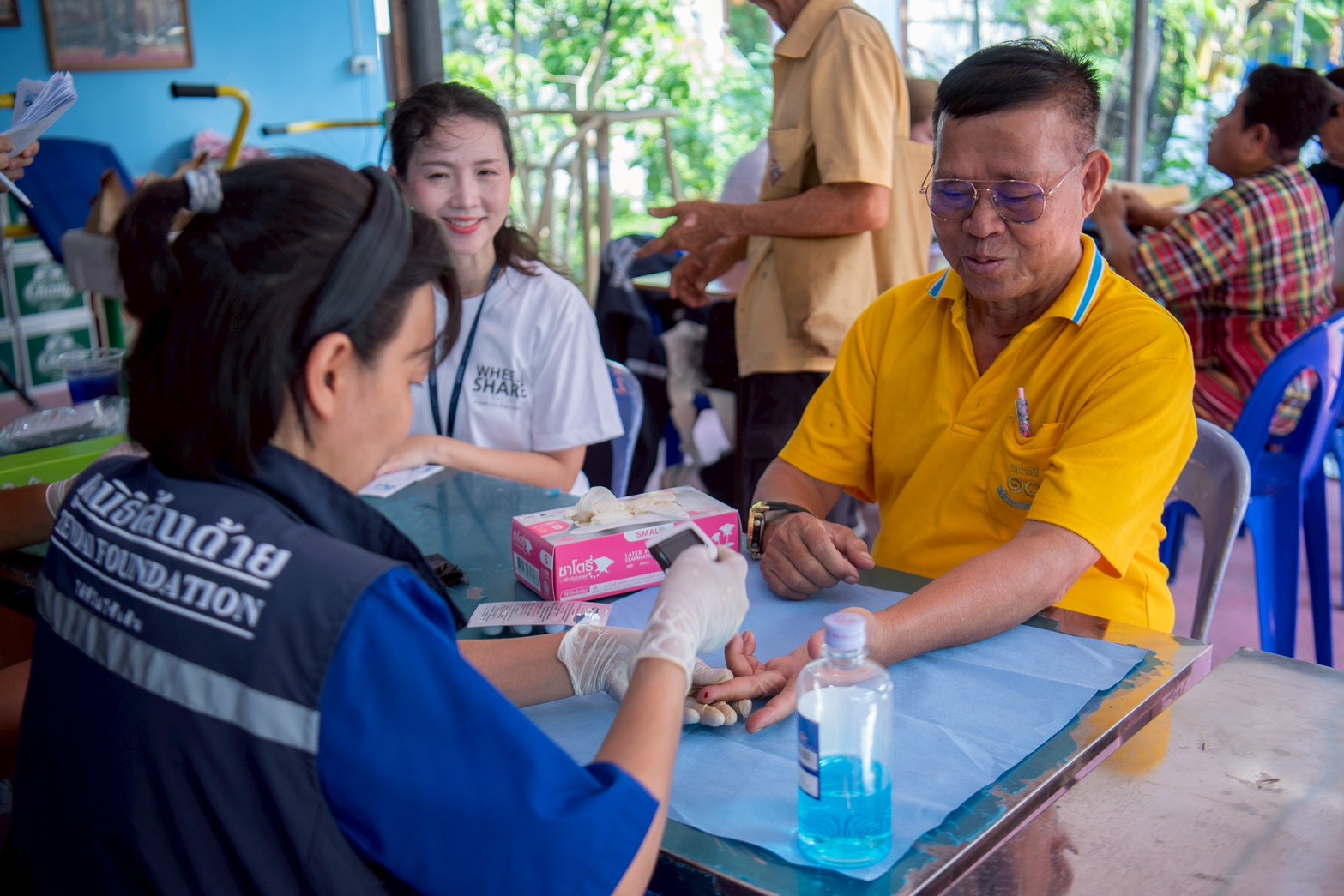 บรรยากาศ ณ ลานกิจกรรมชุมชนเต็มไปด้วยความอบอุ่น มูลนิธิซีพี นำพนักงานเหล่า “ซีพีอาสา” และมูลนิธิเส้นด้าย ได้จัดกิจกรรมตรวจคัดกรองสุขภาพเบื้องต้นให้แก่ผู้สูงอายุในชุมชนกว่า 40 คน เพื่อเป็นการเฝ้าระวังและส่งเสริมสุขภาวะที่ดีเชิงรุก นอกจากนี้ คณะผู้บริหารและทีมจิตอาสายังได้เดินเท้าเข้าสู่ตัวชุมชนเพื่อเยี่ยมบ้านผู้ป่วยและกลุ่มเประบาง พร้อมมอบรถเข็นวีลแชร์และอุปกรณ์ที่จำเป็น เพื่อให้การใช้ชีวิตสะดวกและปลอดภัยยิ่งขึ้น