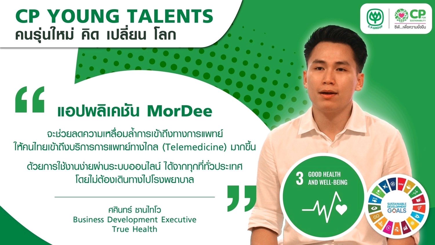 มาฟังมุมมอง “คิด เปลี่ยน โลก” ของ คุณศศินทร์ ซานไทโว Business Development Executive True HEALTH พูดถึงเป้าหมายการพัฒนาที่ยั่งยืน เป้าหมายที่ 3 : สุขภาพและความเป็นอยู่ที่ดี (Good Health and Well-being) การส่งเสริมสุขภาพและความเป็นอยู่ที่ดีให้แก่ประชากรทุกช่วงวัย สุขภาพและความเป็นอยู่ที่ดีจะช่วยให้เรามีแรงขับเคลื่อนในการทำสิ่งต่าง ๆ เพื่อผู้อื่นและสังคม ทำให้เราเห็นว่านอกจากอาหารและโภชนาการที่ดีแล้ว การให้ความสำคัญกับระบบการแพทย์สาธารณะที่ทันสมัย มีคุณภาพ และเข้าถึงได้สำหรับประชากรในทุกช่วงวัยถือเป็นสิ่งที่จำเป็นเช่นกัน