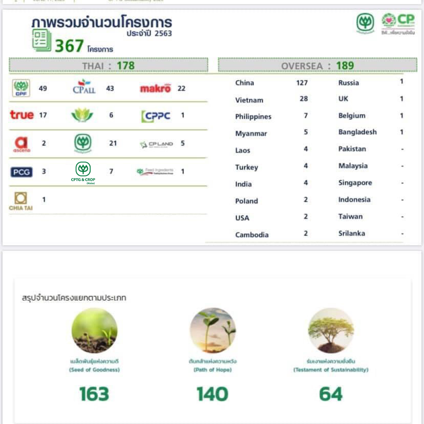 โดย 367 โครงการแยกเป็นผลงานจากกลุ่มธุรกิจต่างๆของเครือฯในประเทศไทย 178 โครงการ ประกอบด้วยซีพีเอฟ 49 โครงการ ซีพีออลล์ 43 โครงการ แม็คโคร 22 โครงการ CP Group 21 โครงการ ทรู17 โครงการ กลุ่มการค้าระหว่างประเทศ 7 โครงการ กลุ่มพืชครบวงจร(ข้าวโพด) 6 โครงการ กลุ่มซีพีแลนด์ 5 โครงการ กลุ่มธุรกิจสัตว์เลี้ยง 3 โครงการ แอสเซนด์ 2 โครงการ กลุ่มวัตถุดิบอาหารสัตว์ 1 โครงการกลุ่มเจียไต๋ 1 โครงการ กลุ่มธุรกิจพลาสติก 1 โครงการ ส่วนโครงการของต่างประเทศ189 โครงการ เป็นของจีน 127 โครงการ เวียดนาม 28 โครงการ ฟิลิปปินส์ 7 โครงการเมียนมา 5 โครงการ ลาว 4 โครงการ ตุรกี 4 โครงการ อินเดีย 4 โครงการ โปแลนด์ 2 โครงการ สหรัฐอเมริกา 2 โครงการ กัมพูชา 2 โครงการ รัสเซีย 1 โครงการ อังกฤษ 1 โครงการ เบลเยี่ยม 1 โครงการ และบังคลาเทศ 1 โครงการ