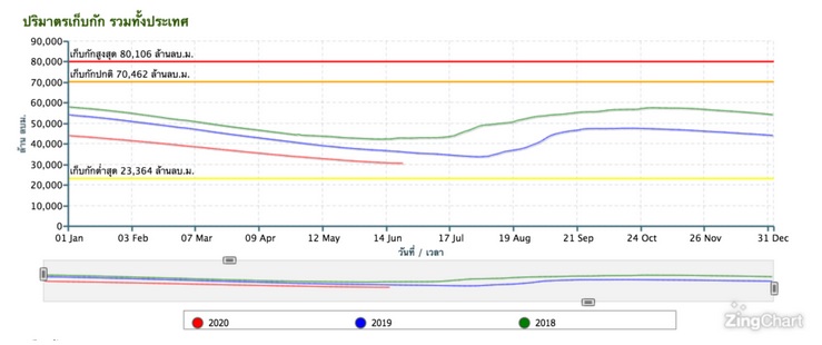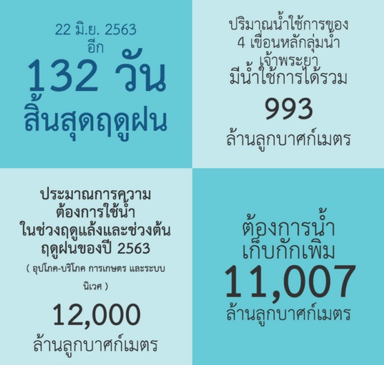 หากดูปริมาตรเก็บกักน้ำรวมทั้งประเทศ จะพบว่า ปี 2563 ประเทศไทยมีความเสี่ยงต่อภัยแล้งอย่างมาก ดังนั้น การเก็บน้ำในช่วงฤดูฝนจึงมีความสำคัญ ซึ่งหากมีการวางแผนและรีบดำเนินการอย่างดี อ่างเก็บน้ำขนาดใหญ่ยังสามารถนำมาใช้ เพื่อกักเก็บน้ำเป็นแก้มลิงในช่วงมรสุม ป้องกันน้ำท่วมได้อีกด้วย