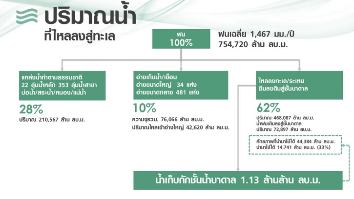 แต่ละปีฝนตก 100% คิดเป็นปริมาณน้ำ 754,720 ล้านลบ.ม. น้ำจะไปอยู่ในแหล่งน้ำธรรมชาติประมาณ 28% หรือคิดเป็นปริมาณน้ำ 210,567 ล้านลบ.ม. และในอ่างเก็บน้ำทั้งประเทศประมาณ 42,620 ล้านลบ.ม. หรือคิดเป็น 10% ของปริมาณน้ำฝน เป้าหมายของโครงการคือ การกักเก็บน้ำที่ปัจจุบันไหลลงสู่ทะเล ระเหยสู่อากาศ หรือซึมลงสู่ชั้นบาดาล ซึ่งมีปริมาณมากถึง 62% ดังนั้น หากมีการบริหารจัดการน้ำที่ดี จะสามารถนำไปใช้ประโยชน์ทางการเกษตรได้อย่างยั่งยืน