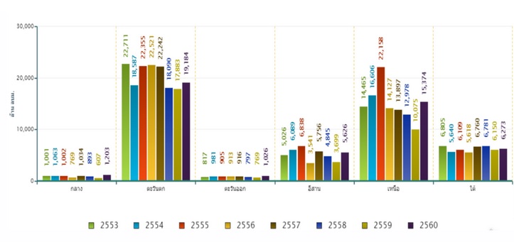 ปริมาณการกักเก็บน้ำควรพิจารณาเป็นรายภาค เพื่อคำนวณว่าจะสามารถกระจายน้ำในพื้นที่การเกษตรได้ครบทุกภาคหรือไม่ จากตารางจะพบว่า ข้อมูล “ภัยแล้ง” ในช่วง 10 ปีที่ผ่านมาโดยเฉลี่ยในเชิงพื้นที่ มีจังหวัดที่ประสบภัย 55 จังหวัด (หรือคิดเป็น 70% ของจังหวัดทั้งหมด) 500 อำเภอ 3,000 ตำบล (หรือคิดเป็น 46% ของจำนวนตำบลทั้งหมด) และ 22,000 หมู่บ้าน ที่ได้รับผลกระทบจากภัยแล้ง