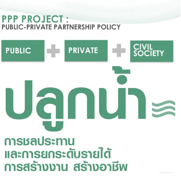 การดำเนินโครงการต้องเป็นความร่วมมือแบบ PPP (Public Private Partnership) ระหว่างภาครัฐ ภาคเอกชน และภาคประชาสังคม ซึ่งรวมถึงเกษตรกร ในรูปแบบที่ภาครัฐให้ประชาชนเข้าไปมีส่วนร่วมในโครงการบริหารจัดการน้ำ และสามารถขายน้ำที่เกษตรกรเป็นเจ้าของอ่างเก็บน้ำขนาดใหญ่ได้ โดยจ่ายค่าเช่าพื้นที่แก่เกษตรกรในระยะยาว เพื่อนำพื้นที่มาขุดบ่อขนาดใหญ่เป็นลักษณะแก้มลิง โดยโฉนดยังเป็นของเกษตรกร และเกษตรกรสามารถขายน้ำไปยังพื้นที่ทำการเกษตร และมีระบบการบริหารจัดการโดยเกษตรกรรุ่นใหม่ เพื่อเพิ่มประสิทธิภาพของการดำเนินงานและบริการ มุ่งเน้นการให้บริการที่มีประสิทธิภาพ คุ้มค่ากับต้นทุนมากกว่าภาครัฐจะเป็นเจ้าของหรือดำเนินการโดยภาครัฐเอง