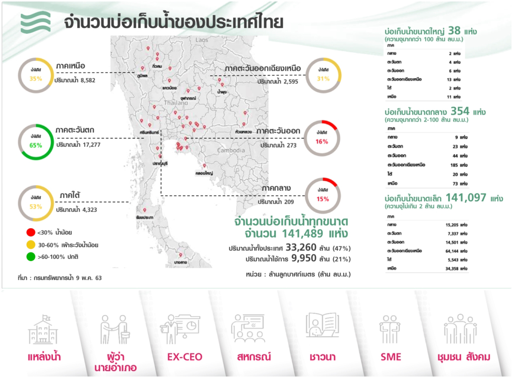 จากภาพจะเห็นว่า ประเทศไทยมีบ่อเก็บน้ำขนาดใหญ่เพียง 38 แห่ง ขนาดกลาง 354 แห่ง และขนาดเล็กมากถึง 141,097 แห่ง แต่ปัญหาคือ เมื่อถึงฤดูแล้ง น้ำในบ่อเก็บน้ำขนาดเล็กจะแห้งระเหยไป ดังนั้น การทำแก้มลิงจึงต้องขุดบ่อขนาดใหญ่ กระจายไปในพื้นที่ที่มีน้ำท่วมซ้ำซาก และใกล้กับพื้นที่ทำการเกษตร เพื่อประหยัดต้นทุนการสูบน้ำไปยังพื้นที่ทำการเกษตร และต้องได้รับความร่วมมือจากหลายภาคส่วน เช่น เจ้าของพื้นที่ที่จะร่วมแปลงนำมาขุดเป็นแหล่งน้ำ ซึ่งจะได้รับค่าเช่า ผู้ว่าราชการจังหวัด นายอำเภอ ที่จะต้องมีส่วนร่วมในการผลักดันนโยบาย ส่งเสริมการนำผู้บริหารที่มีประสบการณ์ในการบริหารธุรกิจที่เกษียณอายุแล้วกลับมาพัฒนาบ้านเกิด การใช้สหกรณ์ที่มีอยู่มาพัฒนาด้วยระบบ IT เพื่อทำการตลาดยุคใหม่ ชาวนาที่ปรับเปลี่ยนมาปลูกพื้นผสมผสานที่ให้ราคาสูง การสร้าง SME ทำธุรกิจท่องเที่ยว ประมง และการบริหารจัดการพืชผลทางการเกษตร รวมถึงการเปิดหน้าร้าน ขายสินค้าให้กับชุมชน นอกจากนี้ยังพัฒนาสังคมและสิ่งแวดล้อมในพื้นที่ให้เกิดความยั่งยืนอีกด้วย