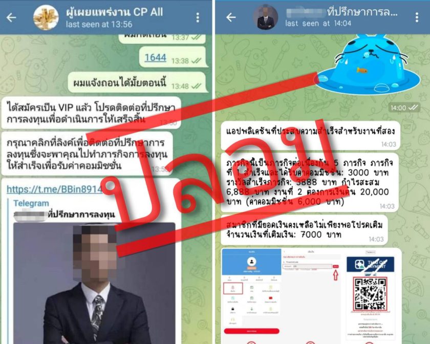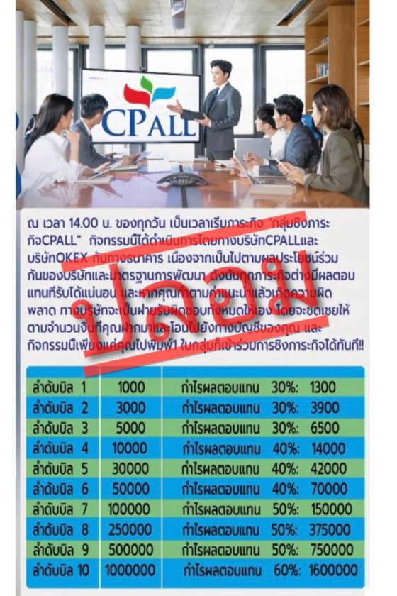ขณะนี้มีกลุ่มมิจฉาชีพ ได้ทำการหลอกลวงโดยการแอบอ้างชื่อและตราสัญลักษณ์ บริษัท ซีพี ออลล์ จำกัด (มหาชน) ชวนเชื่อให้ลงทุนด้วยการโอนเงินเข้าบัญชีของกลุ่มมิจฉาชีพ ซึ่งอ้างว่าเป็นภารกิจลงทุนที่จะได้รับผลตอบแทนที่สูง ทำให้มีผู้หลงเชื่อตกเป็นเหยื่อ และโอนเงินให้กับกลุ่มมิจฉาชีพ