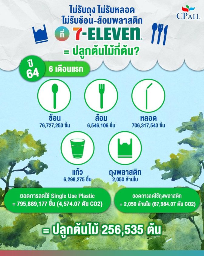 เซเว่นฯ ขอบคุณพลังคนไทยไม่รับถุงและ Single-use plastic ช่วยลดก๊าซเรือนกระจก เทียบเท่าปลูกต้นไม้กว่า 2 แสนต้น ใน 6 เดือน