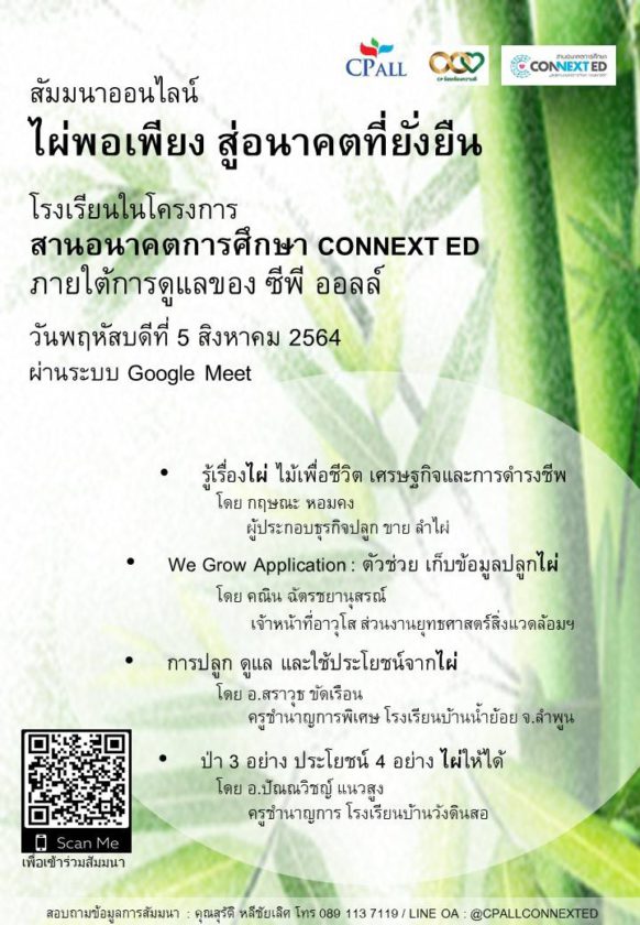 ชวนชาวซีพีร่วมฟังสัมมนา “ไผ่พอเพียงสู่อนาคตที่ยั่งยืน ประจำปี 2564” โครงการเพื่อสนับสนุนโรงเรียนในสานอนาคตการศึกษา CONNEXT ED ภายใต้การดูแลของ ซีพี ออลล์