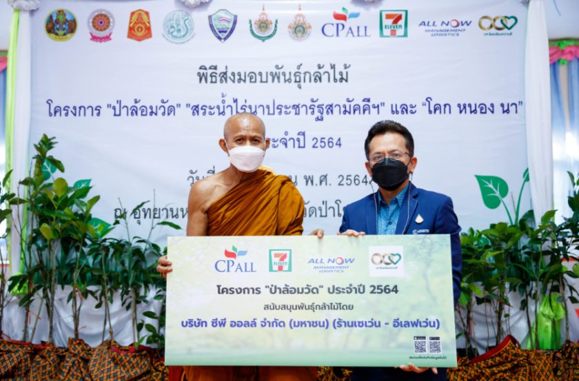 พระครูโสภณธรรมรังษี (ซ้าย) เจ้าคณะอำเภอเมืองสุรินทร์ (ธ) เจ้าอาวาสวัดป่าโยธาประสิทธิ์ เป็นผู้แทนรับถวายพันธุ์กล้าไม้ เพื่อปลูกป่าทดแทนในโครงการ “ป่าล้อมวัด” โดยมี นายตรีเทพ ปาลกะวงศ์ ณ อยุธยา (ขวา) ผู้ช่วยผู้จัดการทั่วไป บริษัท ซีพี ออลล์ จำกัด (มหาชน) ผู้บริหารเซเว่น อีเลฟเว่น และเซเว่น เดลิเวอรี่เป็นผู้แทนถวายพันธุ์ กล้าไม้ ภายใต้โครงการป่าล้อมวัด จำนวน 80,242 ต้น ให้กับวัด 200 แห่งในจังหวัดสุรินทร์เพื่อส่ งเสริมภูมิทัศน์ โดยรอบศาสนสถานและร่วมเป็นเครื อข่ายการสร้างความตระหนักและจิ ตสำนึกด้านสิ่งแวดล้อมให้กับชุ มชน ณ อุทยานหลวงปู่ดูลย์ อตุโล วัดป่าโยธาประสิทธิ์ จังหวัดสุรินทร์