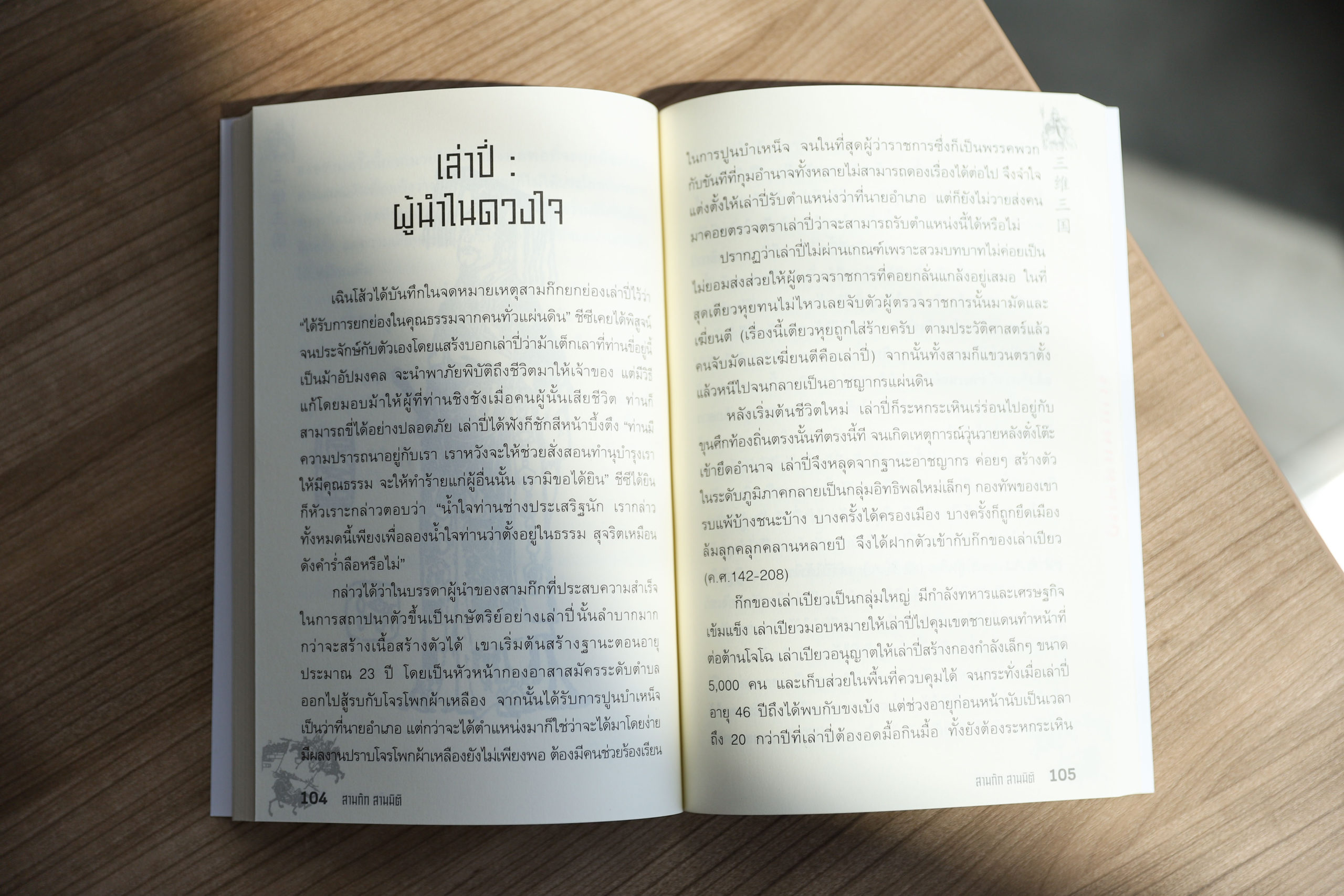 อาทิ “เล่าปี่ ผู้นำในดวงใจ” กล่าวได้ว่า ในบรรดาผู้นำของสามก๊ก ที่ประสบความสำเร็จในการสถาปนาตัวขึ้นเป็นกษัตริย์อย่างเล่าปี่นั้นลำบากมาก กว่าจะสร้างเนื้อสร้างตัวได้ เขาเริ่มต้นสร้างฐานะตอนอายุ 23 ปีความสำเร็จของเล่าปี่ นอกเหนือจากการที่เขามีภาพลักษณ์ที่ดี เป็นที่ประจักษ์แก่สายตาคนทั่วทั้งแผ่นดินว่ารักใคร่ประชาชน มีเมตตาธรรม รักพวกรักพ้อง รักพี่รักน้อง เช่น กวนอู และเตียวหุยแล้ว เขายังมีคุณสมบัติกล้าที่จะใช้คน ซึ่งสิ่งเหล่านี้เป็นปัจจัยสำคัญที่ทำให้เล่าปี่ประสบความสำเร็จ เมื่อรู้ถึงคุณค่าของขงเบ้งแล้ว เล่าปี่กล้าที่จะมอบอำนาจต่างๆให้ขงเบ้งไปบริหาร