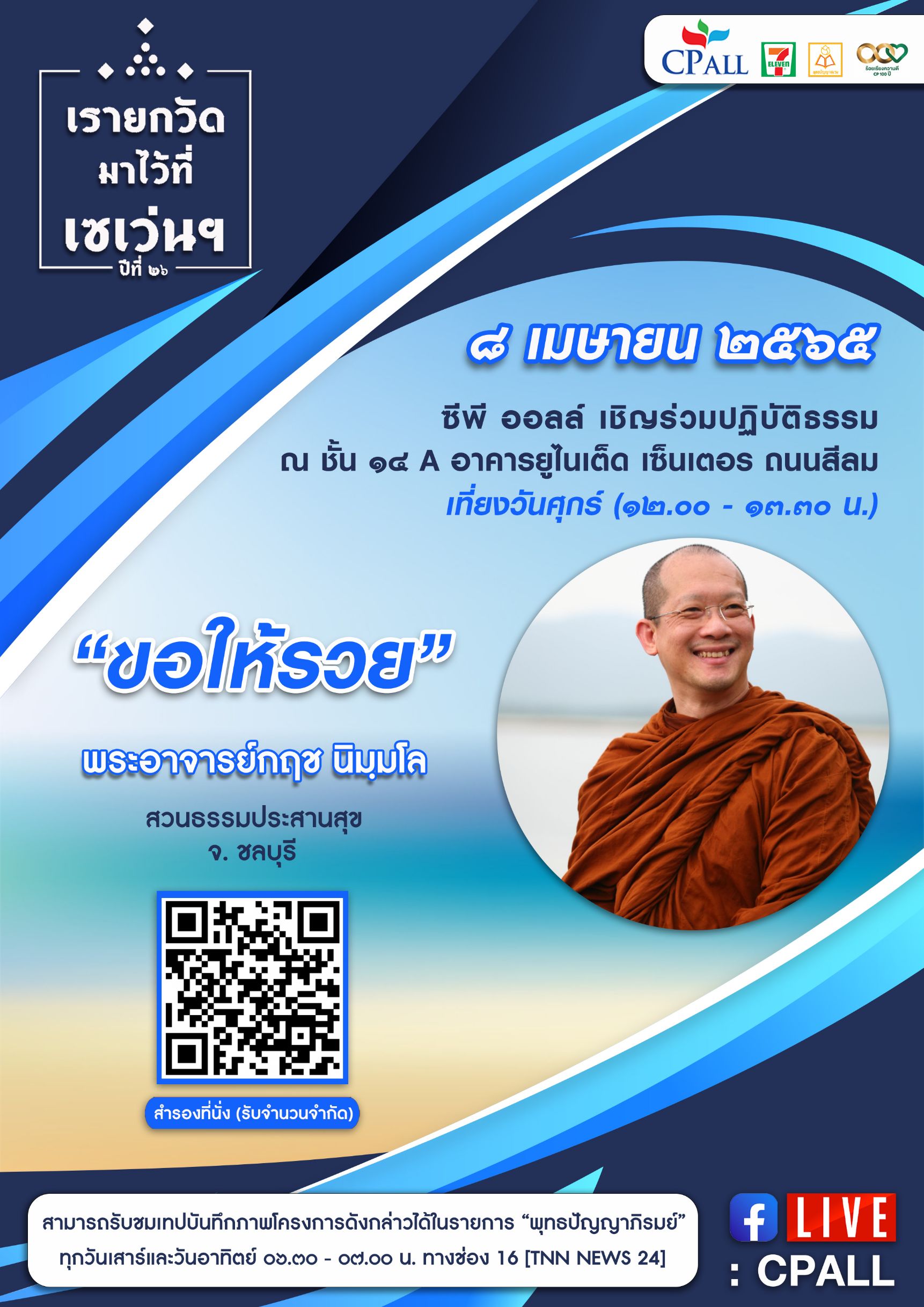 พรุ่งนี้วันศุกร์ที่ 8 เมษายน เรามีนัดมาปฏิบัติธรรมและฟังธรรมะดีๆ พบกับ พระอาจารย์กฤช นิมมโถ สวนธรรมประสานสุข จ. ชลบุรี สนทนาธรรมในหัวข้อ “ขอให้รวย” บนเวที “เรายกวัดมาไว้ที่เซเว่นฯ” ณ ห้องประชุม ชั้น 14 A อาคารยูไนเต็ด เซ็นเตอร์ ถนนสีลม หรือรับชมถ่ายทอดสดผ่าน Facebook Live เพจ CP ALL ได้ตั้งแต่เวลา 12.00-13.30 น. ได้ที่ www.facebook.com/cpall7/