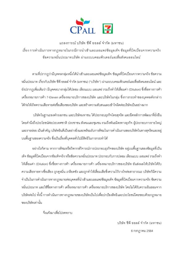 แถลงการณ์ บริษัท ซีพี ออลล์ จำกัด (มหาชน) เรื่อง “การดำเนินการทางกฎหมายกรณีการนำเข้าและเผยแพร่ข้อมูลเท็จ ข้อมูลที่บิดเบือนจากความจริง ข้อความหมิ่นประมาทบริษัท ผ่านระบบคอมพิวเตอร์และสื่อออนไลน์”