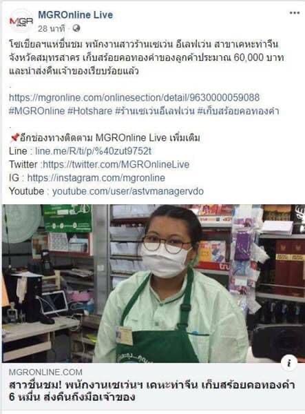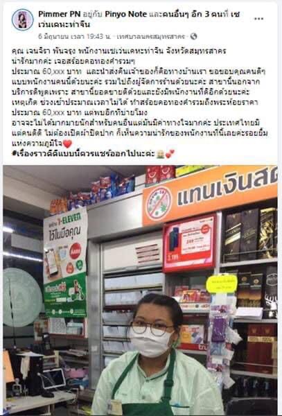 เรื่องราวน่าชื่นชมที่เป็นกระแสดังในโลกโซเชียล เมื่อวันที่ 6 มิถุนายน ที่ผ่านมา เพจเฟซบุ๊กชื่อ Pimmer PN ได้มีการโพสชื่นชม และขอบคุณในความดีของน้องพนักงานร้านเซเว่นฯ จ.สมุทรสาคร ที่เก็บสร้อยทองรวมมูลค่าประมาณ 60,000 บาท ส่งคืนให้กับเจ้าของ จนมีคนนำไปแชร์ต่อกันกว่า 1,500 ครั้ง และเป็นกระแสชื่นชมในความซื่อสัตย์ของน้องพนักงานร้านเซเว่นฯ ในโลกออนไลน์