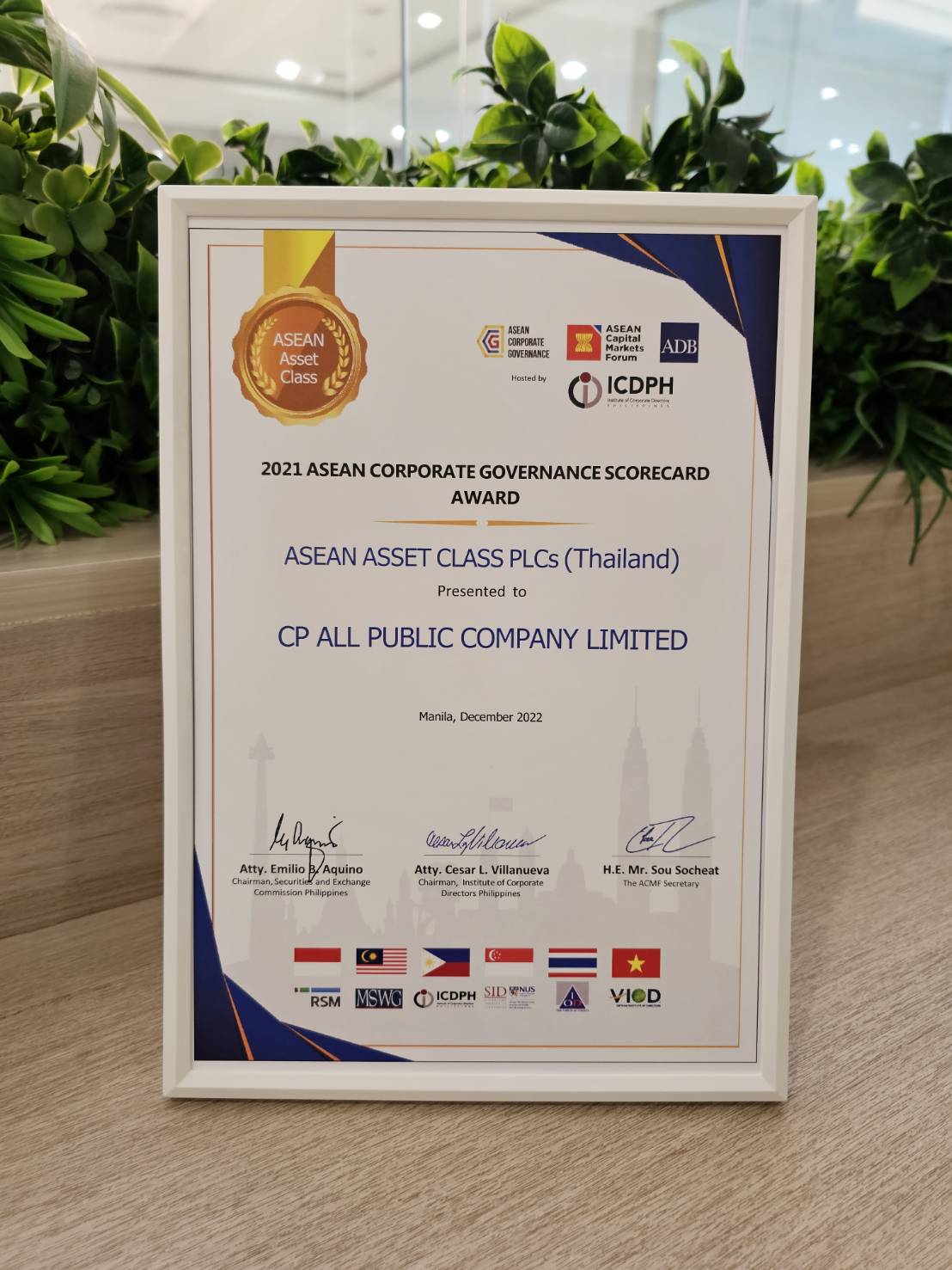 บริษัท ซีพี ออลล์ จำกัด (มหาชน) ผู้บริหารเซเว่น อีเลฟเว่น และเซเว่น เดลิเวอรี่ ได้รับรางวัล ASEAN Corporate Governance Scorecard ประจำปี 2564 ประเภท ASEAN Asset Class PLCs (Thailand) ซึ่งมอบให้บริษัทจดทะเบียนที่ทำคะแนนได้ตั้งแต่ 97.5 คะแนนขึ้นไป แสดงให้เห็นถึงความมุ่งมั่นในด้านการกำกับดูแลกิจการที่ดี เป็นที่ยอมรับในระดับสากล โดย Institute of Corporate Directors, Philippines เป็นเจ้าภาพประกาศรางวัลในรูปแบบ virtual event