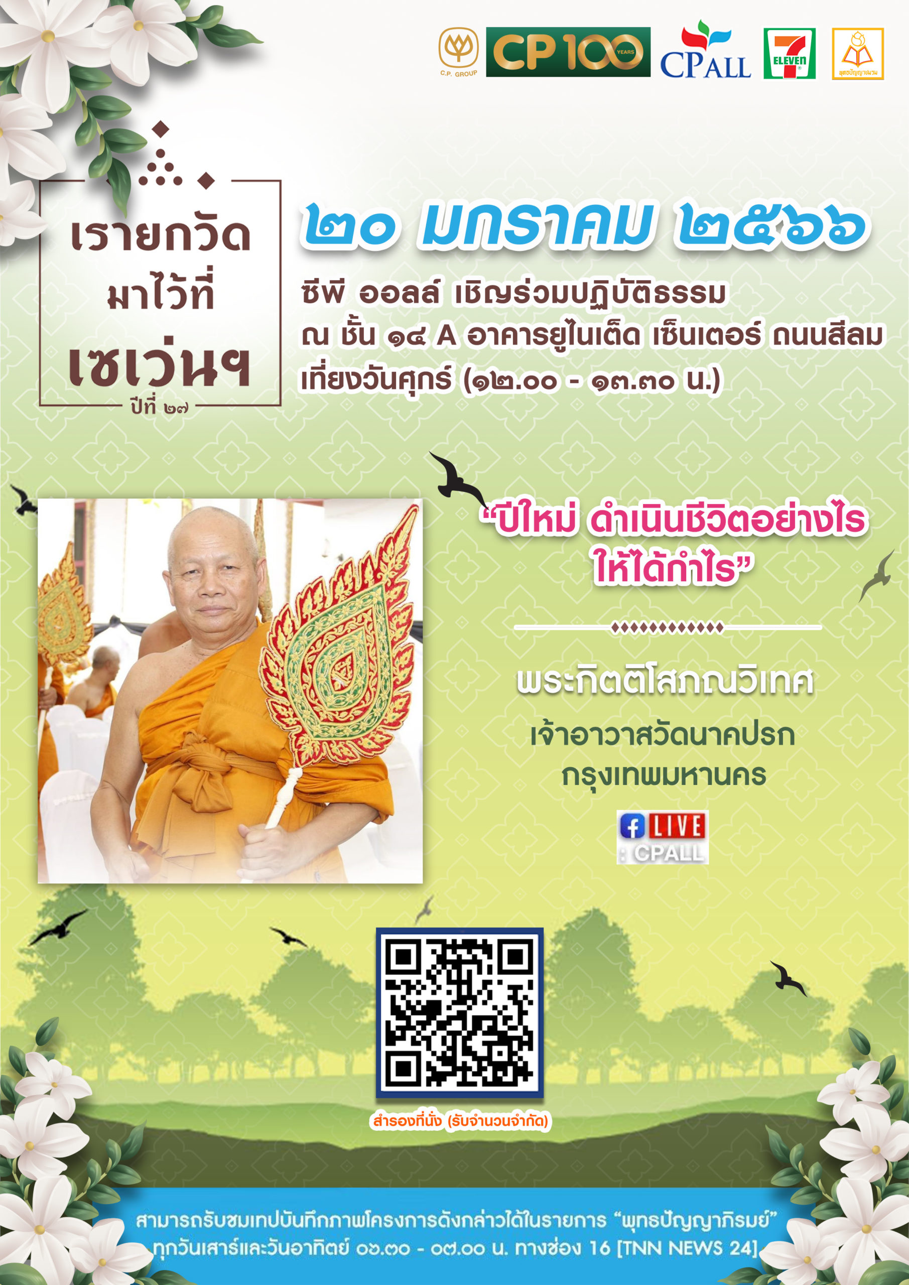 🙏😊 พรุ่งนี้วันศุกร์ที่ 20 มกราคม เรามีนัดมาฟังธรรมะดีๆ พบกับ พระกิตติโสภณวิเทศ เจ้าอาวาสวัดนาคปรก กรุงเทพฯ สนทนาธรรมในหัวข้อ “ปีใหม่ ดำเนินชีวิตอย่างไร ให้ได้กำไร” บนเวที “เรายกวัดมาไว้ที่เซเว่นฯ” ณ ห้องประชุม ชั้น 14 A อาคารยูไนเต็ด เซ็นเตอร์ ถนนสีลม หรือรับชมถ่ายทอดสดผ่าน Facebook Live เพจ CP ALL ได้ตั้งแต่เวลา 12.00-13.30 น. ได้ที่ => www.facebook.com/cpall7/