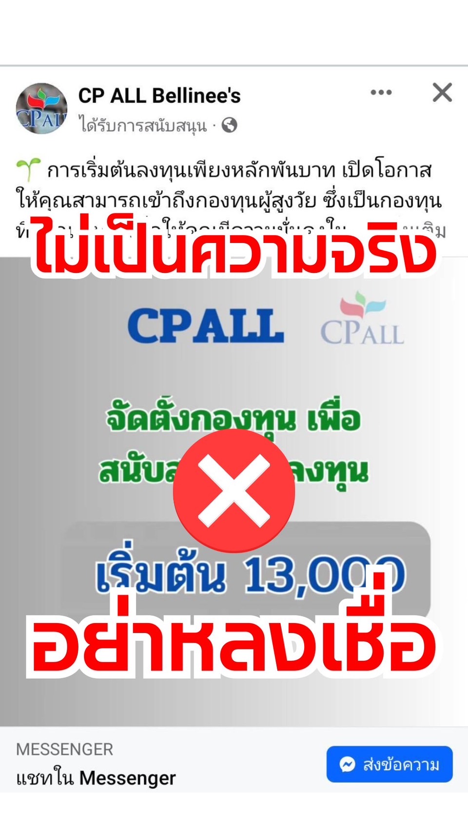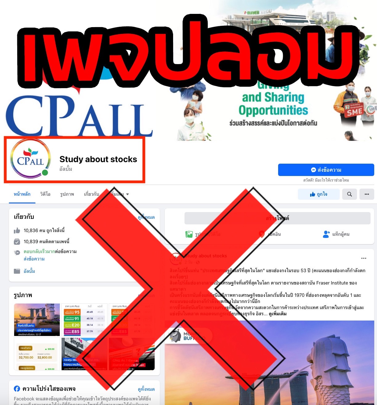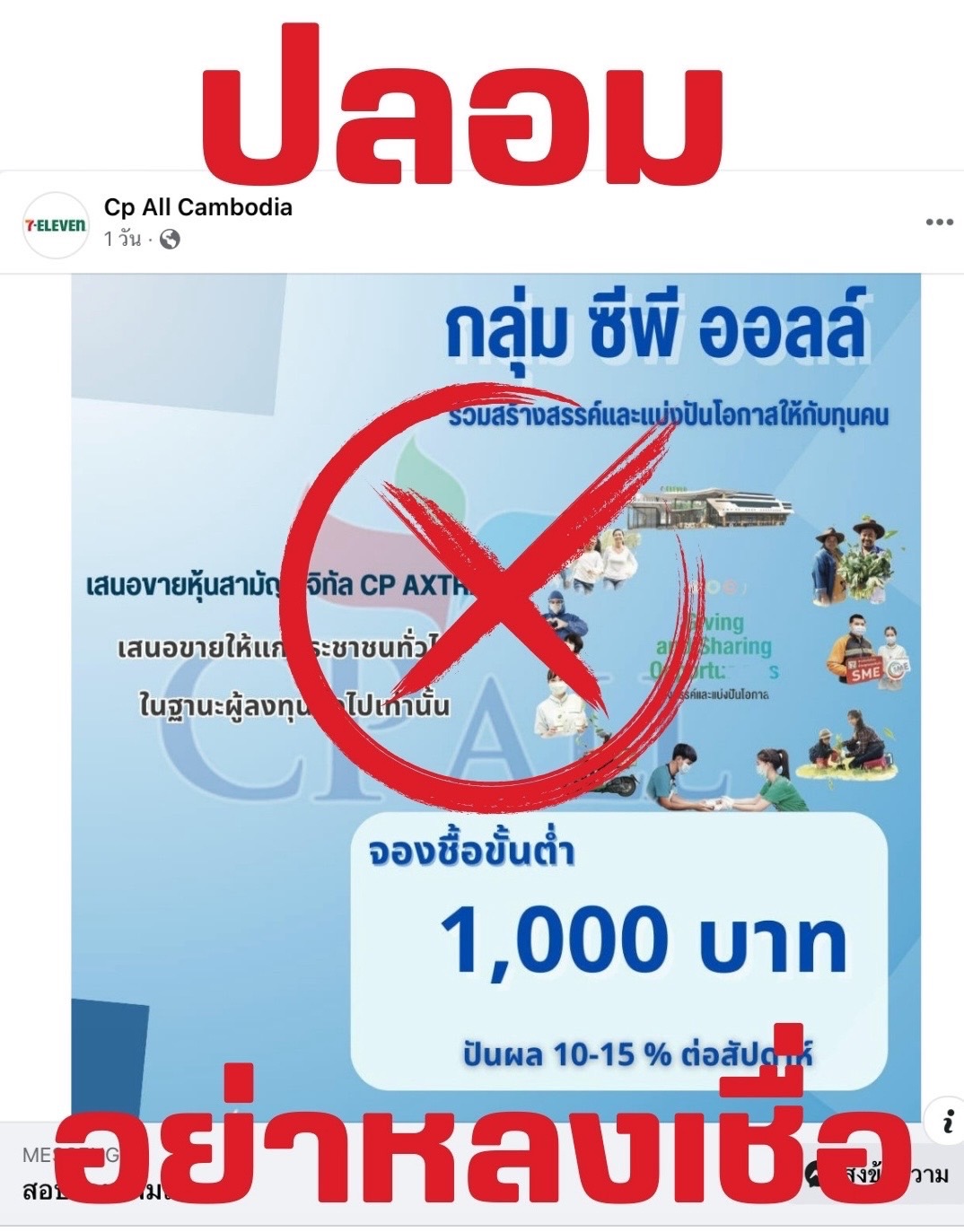 ตามที่ปรากฏในสื่อสังคมออนไลน์ ว่ามีการนำชื่อ บริษัท ซีพี ออลล์ จำกัด (มหาชน) (“บริษัทฯ”) ตราสัญลักษณ์ (โลโก้) และภาพผู้บริหาร ไปใช้แอบอ้างและเผยแพร่ลงโฆษณาผ่านเว็บไซต์ หรือสื่อสังคมออนไลน์ อาทิ Facebook, Instagram, TikTok และอื่น ๆ เพื่อชักชวนและหลอกลวงให้ลงทุนในหลายรูปแบบ จากการตรวจสอบข้อมูลพบว่า เป็นเพจปลอมและเป็นการแอบอ้างชื่อบริษัทฯเพื่อหลอกลวงให้ลงทุน ดังนั้นบริษัทฯจึงขอให้ประชาชนโปรดระมัดระวังอย่าหลงเชื่อกลุ่มมิจฉาชีพดังกล่าว
