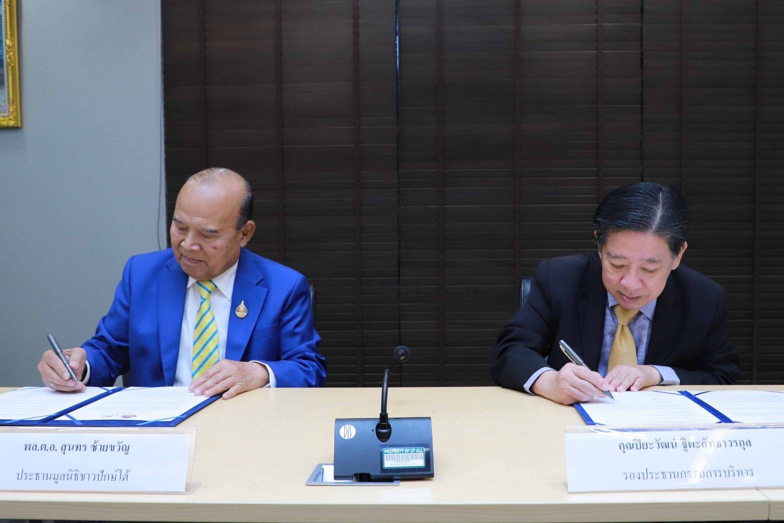 ภายในงานนำโดย นายปิยะวัฒน์ ฐิตะสัทธาวรกุล รองประธานกรรมการบริหาร บมจ. ซีพี ออลล์ และ พลตำรวจเอก สุนทร ซ้ายขวัญ ประธานมูลนิธิชาวปักษ์ใต้ ร่วมลงนาม พร้อมด้วย นายสุวิทย์ กิ่งแก้ว ที่ปรึกษาอาวุโสคณะเจ้าหน้าที่บริหาร บมจ. ซีพี ออลล์ นายโตมร จันทรา ผู้จัดการทั่วไปอาวุโส สำนักประสานรัฐกิจ ดร.วิชา จุ้ยชุม กรรมการมูลนิธิชาวปักษ์ใต้ นายสุรพงษชัย ลิ้มภิกุล เหรัญญิกมูลนิธิชาวปักษ์ใต้ ร่วมเป็นพยาน เพื่อสร้างโอกาสทางการศึกษาแก่เยาวชนในจังหวัดภาคใต้ ให้ได้มีโอกาสศึกษาต่อระดับอาชีวศึกษาและอุดมศึกษา