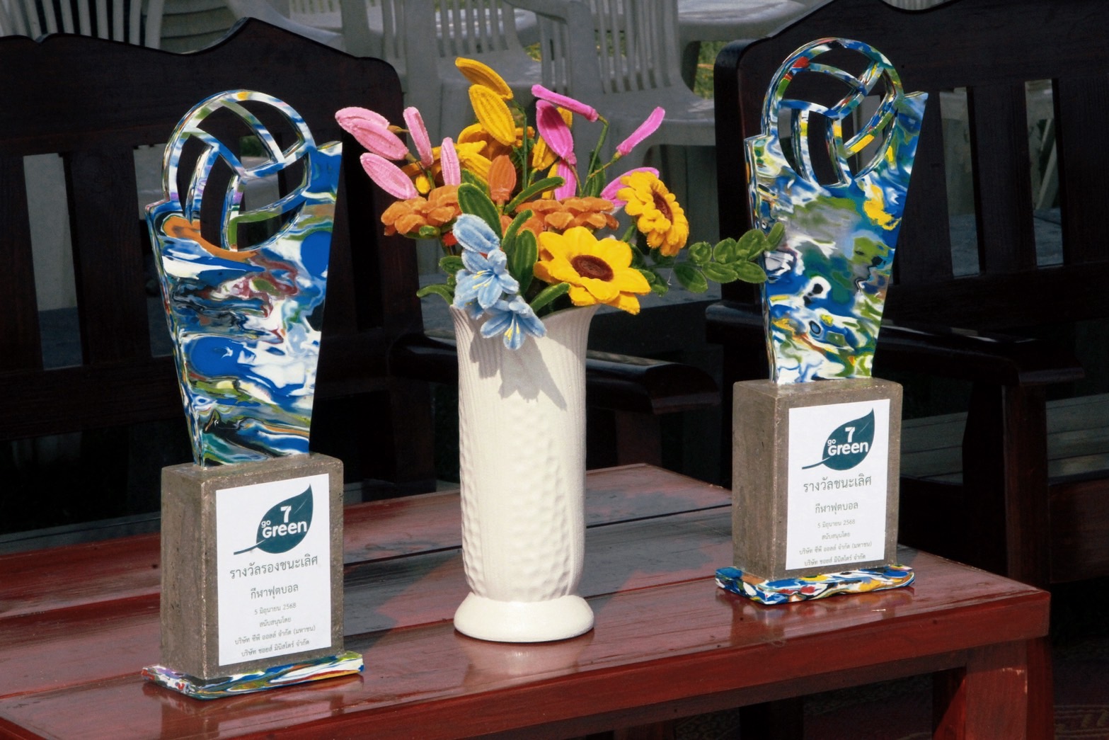 - ถ้วยและเหรียญรางวัลทำจากฝาขวดพลาสติก สามารถลดปริมาณขยะพลาสติกทิ้งลงหลุมฝังกลบไปได้รวม 5 กิโลกรัม