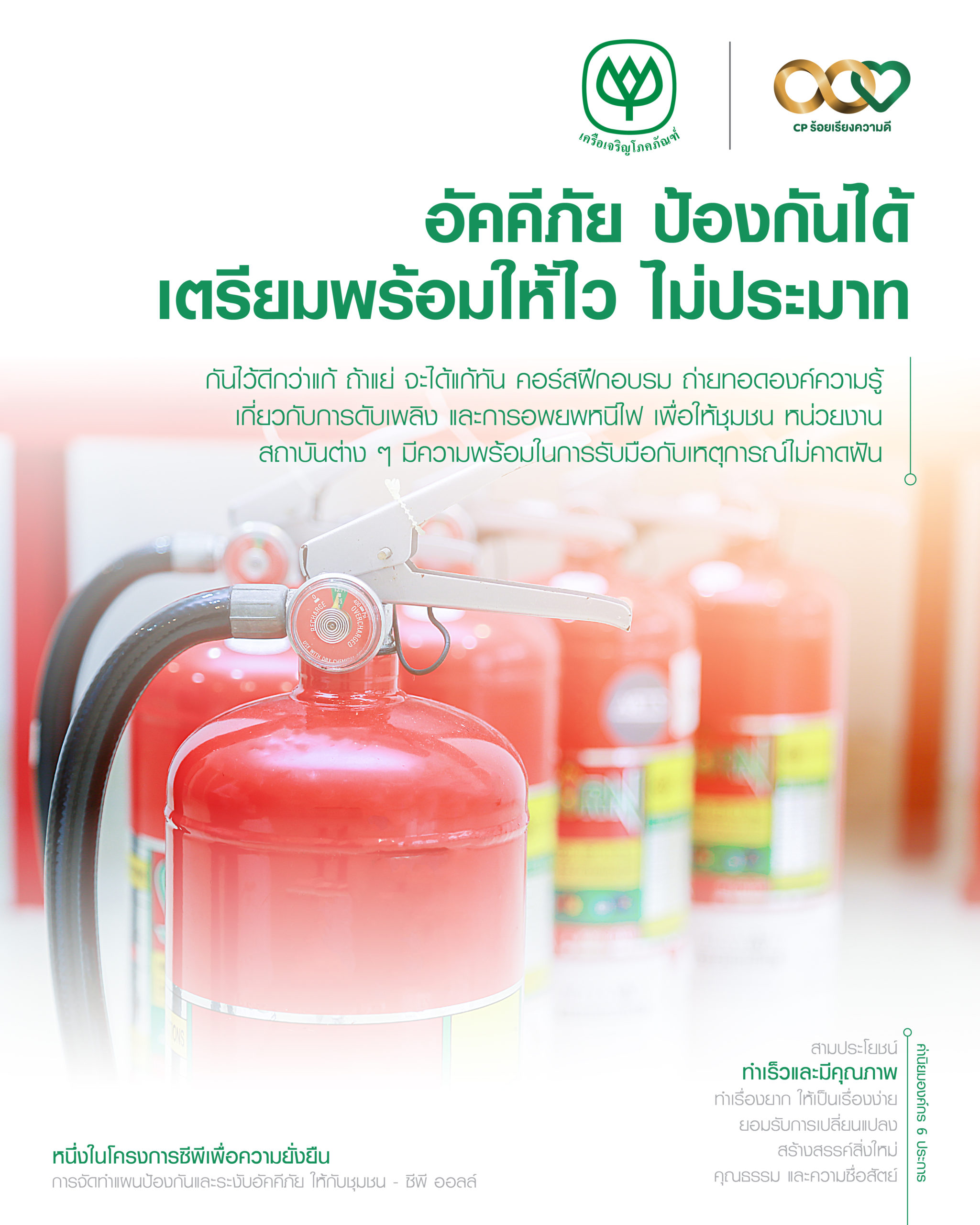 ซีพี ออลล์ เล็งถึงปัญหาอัคคีภัย มากว่า20ปี ถ่ายทอดความรู้ดับเพลิงและอพยพหนีไฟ ให้ ราชการ สถานศึกษา โรงพยาบาล สถานเด็กอ่อน ชุมชน ผู้ด้อยโอกาส โดยรวมกว่า 190 ครั้ง มีผู้รับการอบรมกว่า 56,000 คน ผ่านการจัดทำแผนป้องกันและระงับอัคคีภัย และการฝึกซ้อมอพยพหนีไฟให้กับกลุ่มเปราะบาง(Prepare Fire Safety Emergency Plan & Basic Fire Fighting And Evacuation Fire Drill For Vulnerable Group)