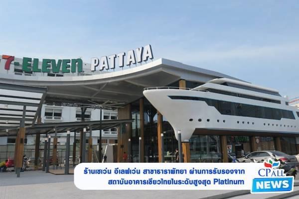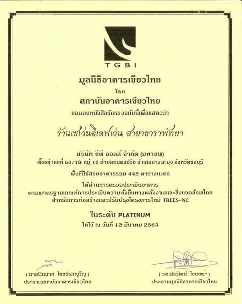อีกหนึ่งความภาคภูมิใจของซีพี ออลล์ ล่าสุด ร้านเซเว่น อีเลฟเว่น สาขาธาราพัทยา ร้าน Flagship Store ซึ่งบริษัทฯให้ความสำคัญในก่อสร้างร้านสาขา ที่เป็นมิตรต่อ สังคม ชุมชน และสิ่งแวดล้อม ได้รับรางวัลมาตรฐานอาคารเขียว จนได้ผ่านการตรวจประเมินอาคารตามมาตรฐานเกณฑ์ การประเมินความยั่งยืนทางพลังงานและสิ่งแวดล้อมไทย สำหรับการก่อสร้างและปรับปรุงโครงการใหม่ TREES-NC ด้วยคะแนนการประเมิน 62 คะแนน ในระดับ Platinum สูงสุด ซึ่งเกณฑ์รางวัลอาคารเขียว ประกอบด้วยทั้งหมด 8 หมวด ได้แก่