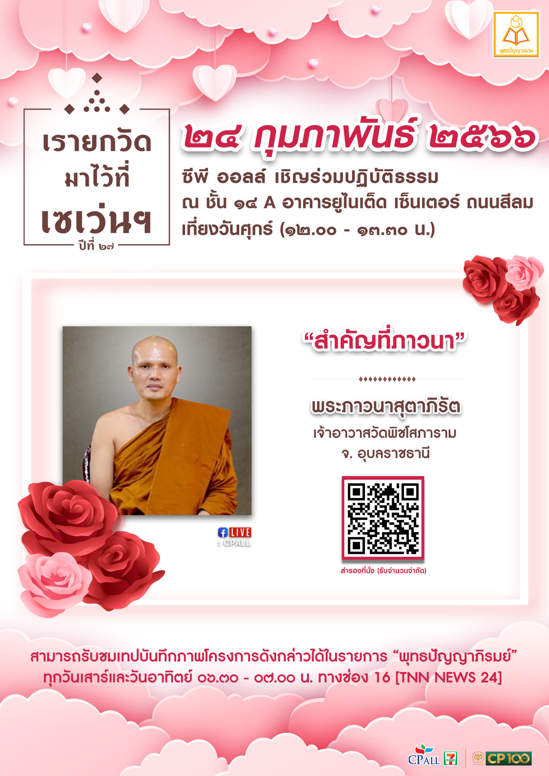 🙏😊 พรุ่งนี้วันศุกร์ที่ 24 กุมภาพันธ์ เรามีนัดมาฟังธรรมะดีๆ พบกับ พระภาวนาสุตาภิรัต เจ้าอาวาสวัดพิชโสภาราม จ. อุบลราชธานี สนทนาธรรมในหัวข้อ “สำคัญที่ภาวนา” บนเวที “เรายกวัดมาไว้ที่เซเว่นฯ” ณ ห้องประชุม ชั้น 14 A อาคารยูไนเต็ด เซ็นเตอร์ ถนนสีลม หรือรับชมถ่ายทอดสดผ่าน Facebook Live เพจ CP ALL ได้ตั้งแต่เวลา 12.00-13.30 น. ได้ที่ => www.facebook.com/cpall7/