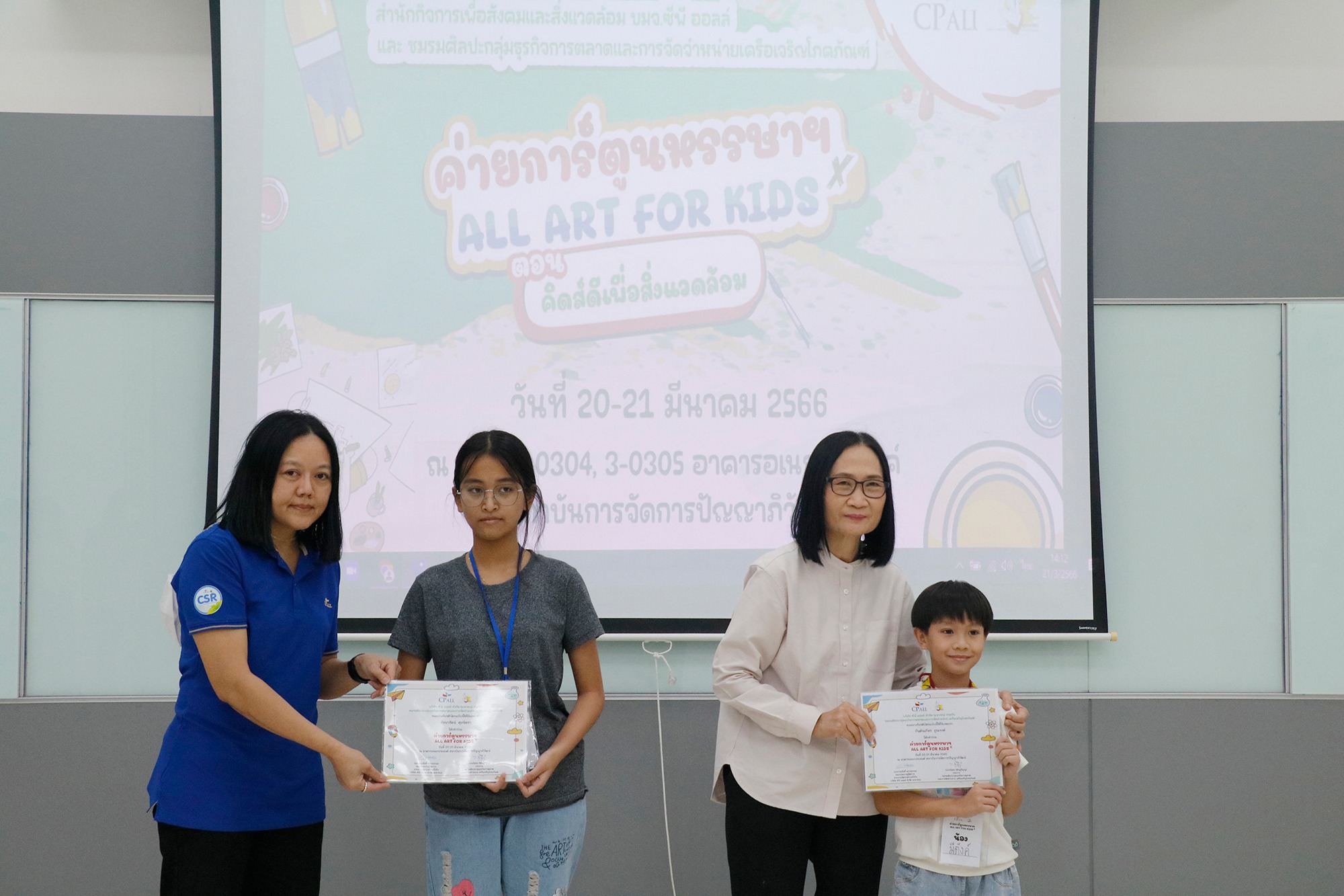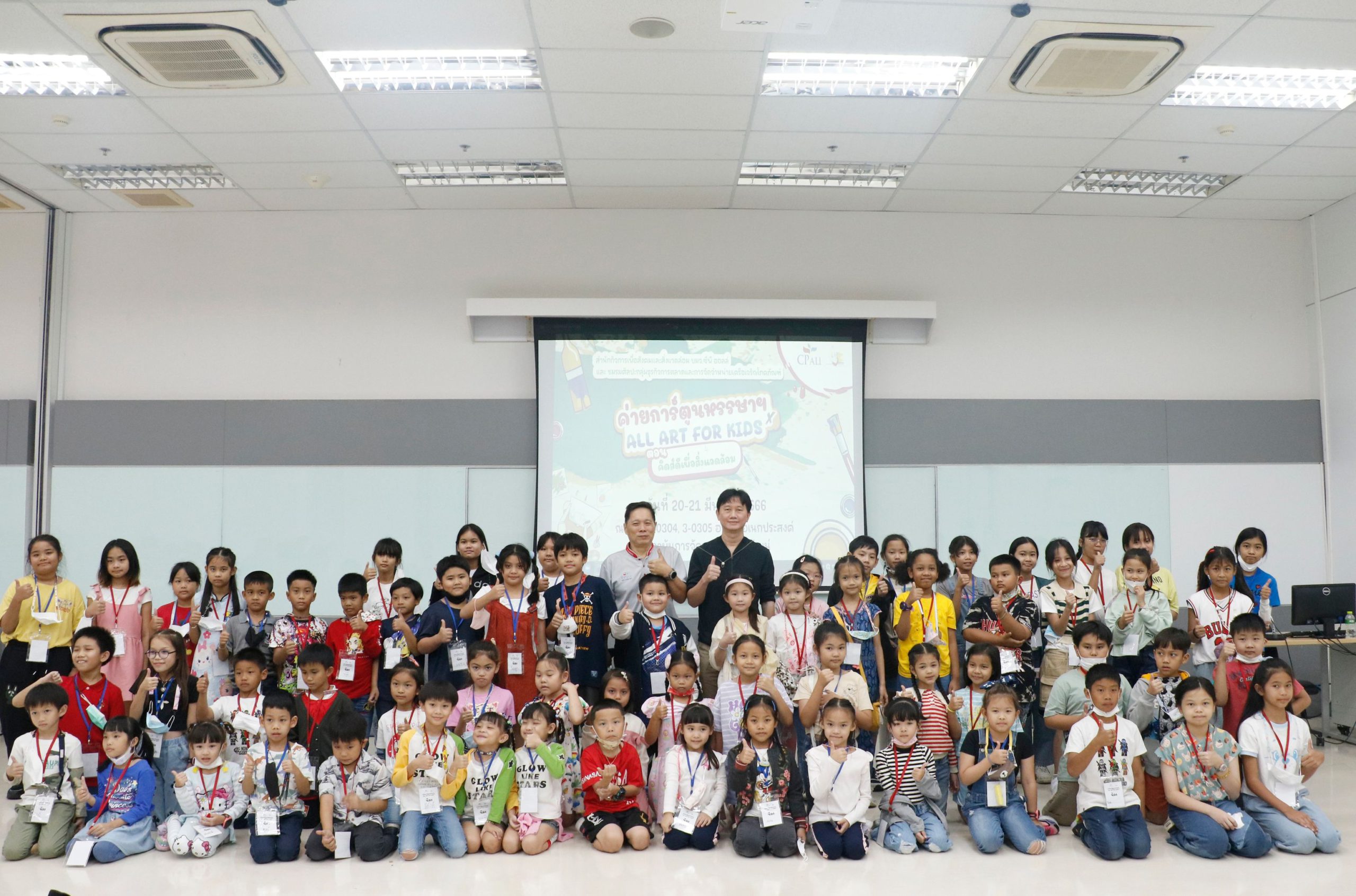 เมื่อวันที่ 20-21 มีนาคม 2566 สำนักกิจการเพื่อสังคมและสิ่งแวดล้อม ร่วมกับชมรมศิลปะกลุ่มธุรกิจการตลาดและการจัดจำหน่าย เครือเจริญโภคภัณฑ์บริษัท ซีพี ออลล์ จำกัด (มหาชน) จัดโครงการ “ค่ายการ์ตูนหรรษา X ALL ART FOR KIDS ตอน คิดส์ดีเพื่อสิ่งแวดล้อม” สำหรับบุตรหลานพนักงาน โดยมีเยาวชนอายุระหว่าง 6-12 ปี เข้าร่วมกิจกรรมทั้งสิ้น 71 คน ณ อาคารอเนกประสงค์ สถาบันการจัดการปัญญาภิวัฒน์ ชั้น 3