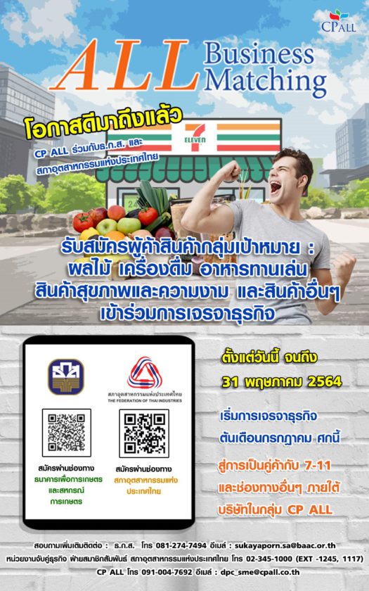 ทั้งนี้ เพื่อเปิดโอกาสเจรจาเป็นคู่ค้า กับ 7-Eleven และช่องทางการค้าอื่นๆ ภายใต้บริษัทในกลุ่ม CP ALL ผ่านช่องทางของ ธ.ก.ส. และสภาอุตสาหกรรมแห่งประเทศไทย จัดกิจกรรมการเจรจาธุรกิจในต้นเดือนกรกฎาคม โดยมีการรับสมัครผู้ประกอบการ จนถึง 31 พฤษภาคมนี้เท่านั้น!